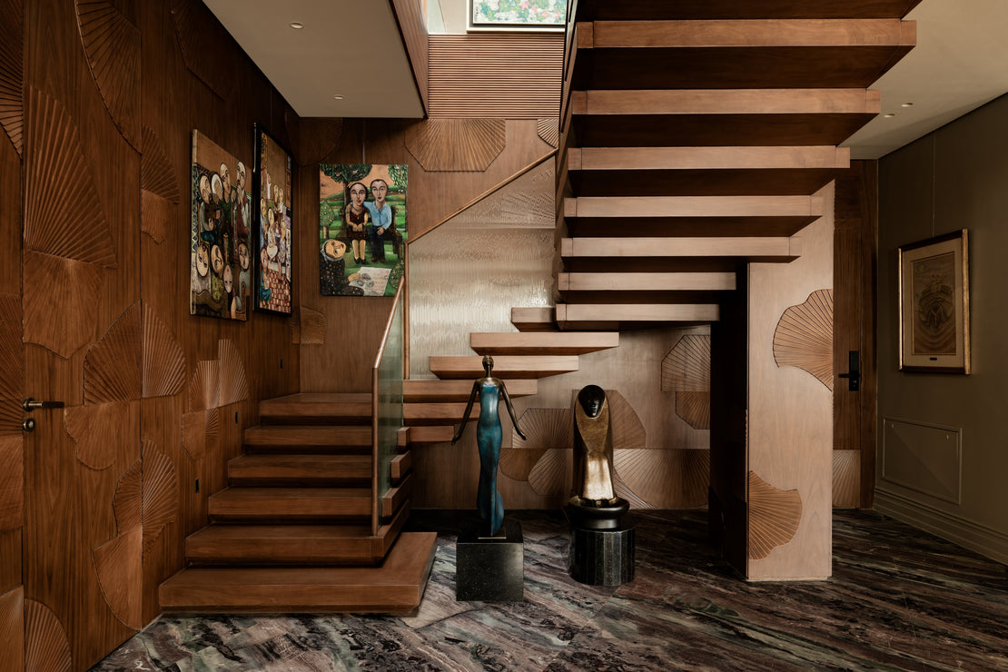 Guided by Shewekar’s vision, the architecture was thoughtfully elevated to embrace the client’s treasured art collection. The staircase was introduced to seamlessly connect the two levels and transformed into a sculptural centerpiece, an art piece in its own right that sets the aesthetic tone of the space. Refined woodwork, bespoke detailing, and handcrafted elements create a luxurious backdrop that allows each piece to breathe and ensures the space enhances rather than competes with its contents.