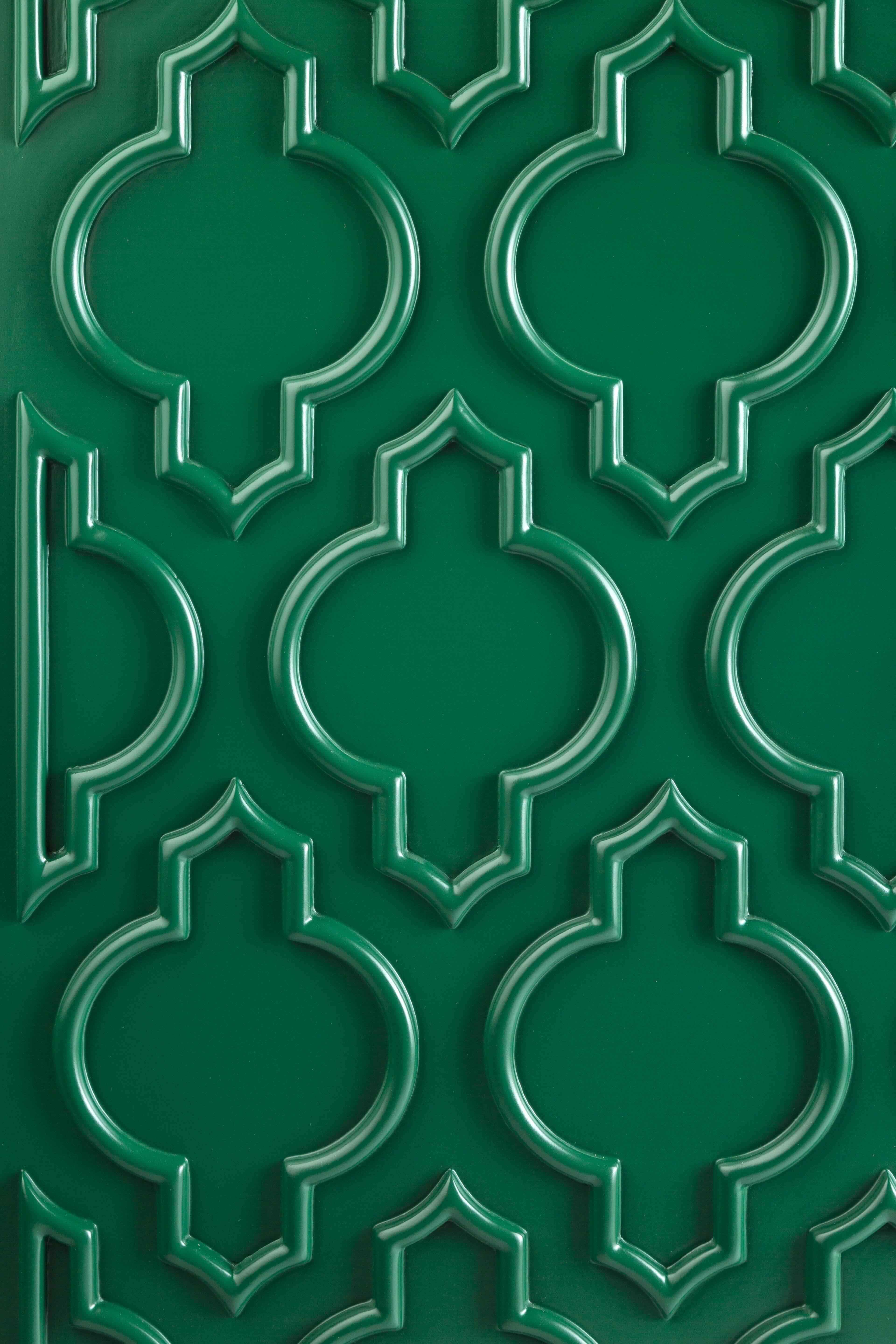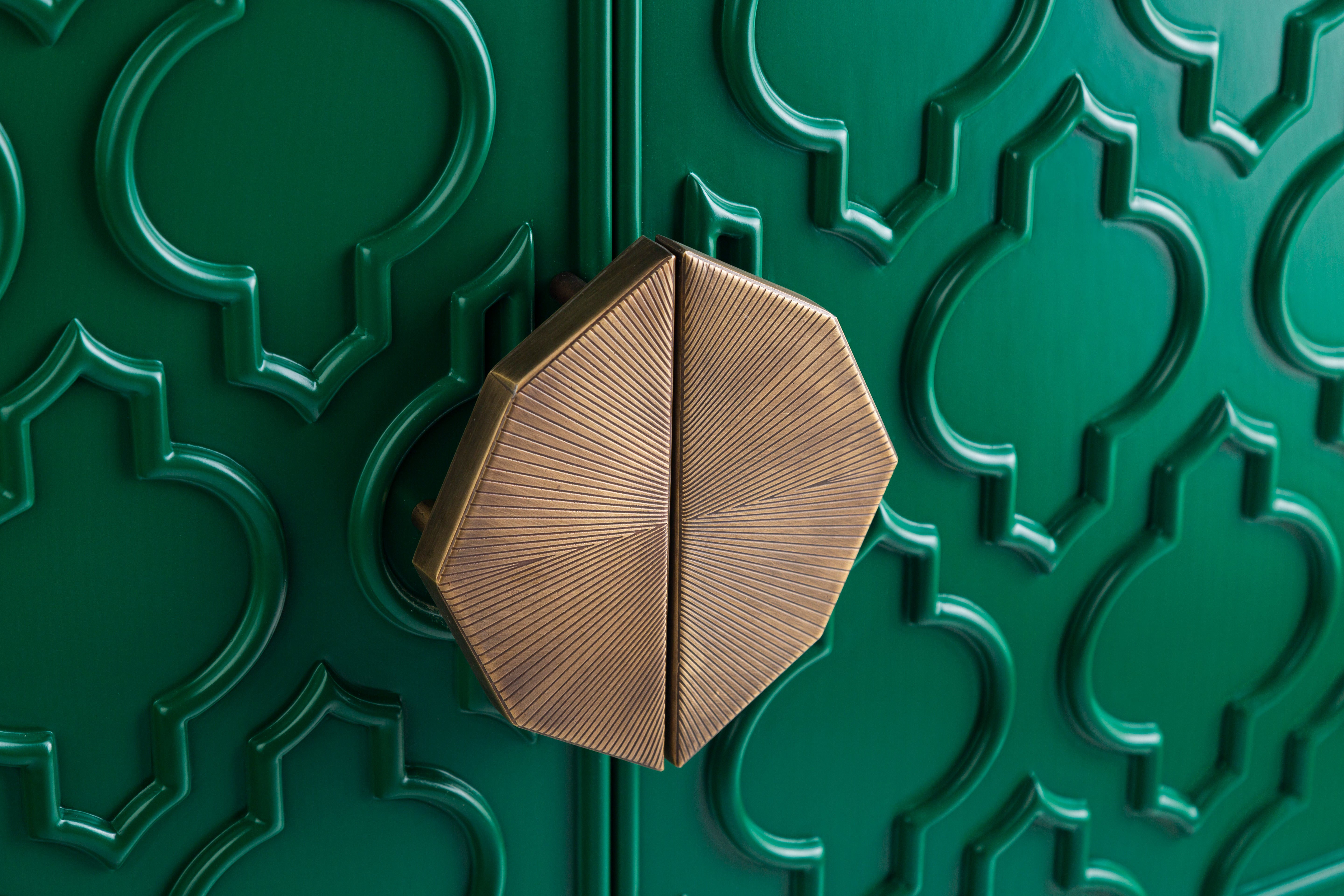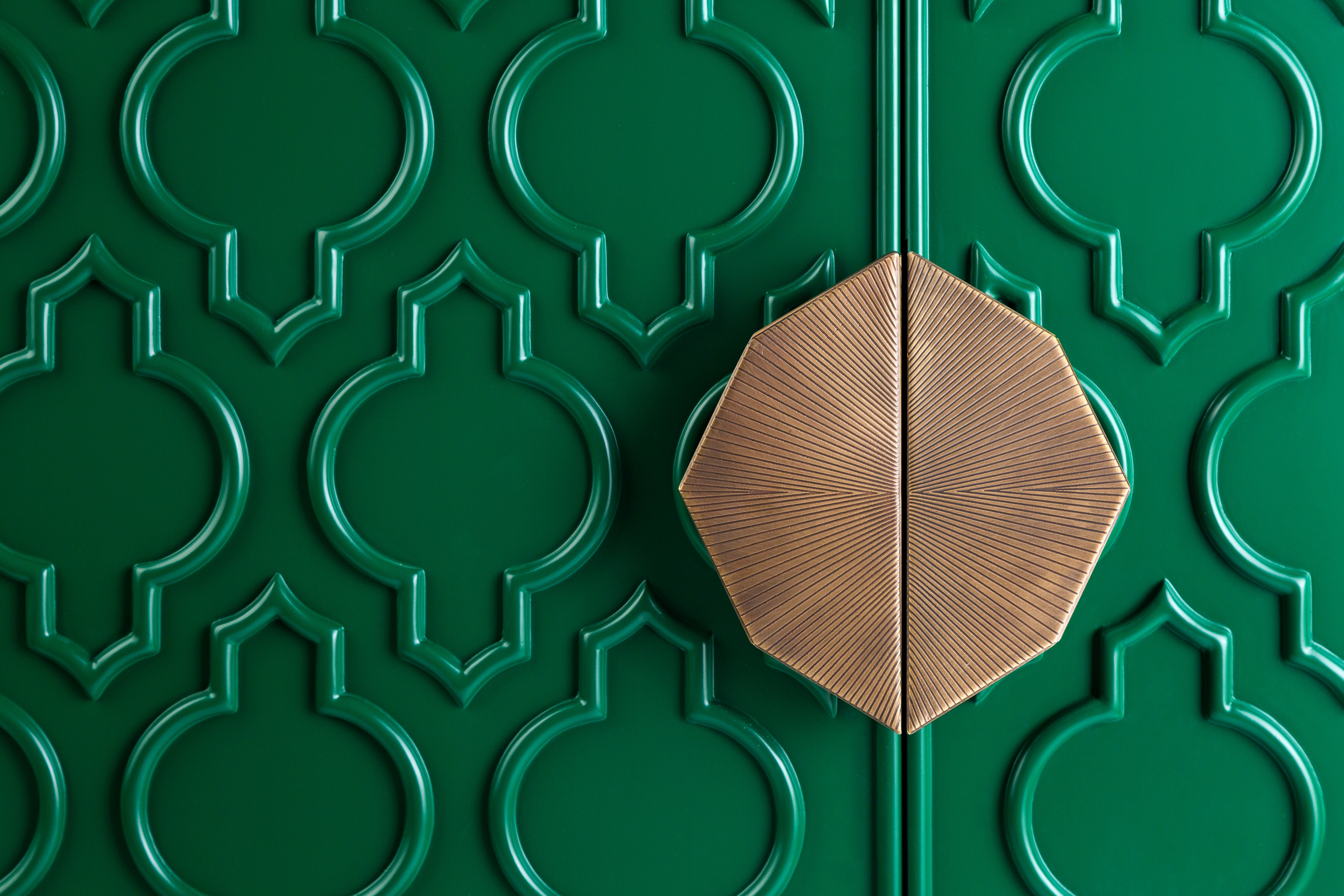 The art deco buffet is inspired by our rich Islamic heritage. The Islamic motif is painted in royal green for an artsy pop of color, giving it a modern twist. The bespoke piece is accentuated with lustrous copper handles and a copper base to beautifully elevate your space.