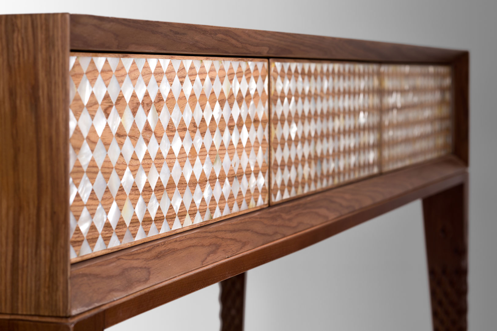 If you are looking to add a glam bam to your house, our bespoke console is a must-add piece to your place. It is made from walnut wood and oak veneer that are magnificently decorated with a perfectly crafted, delicate geometric mother of pearl pattern.