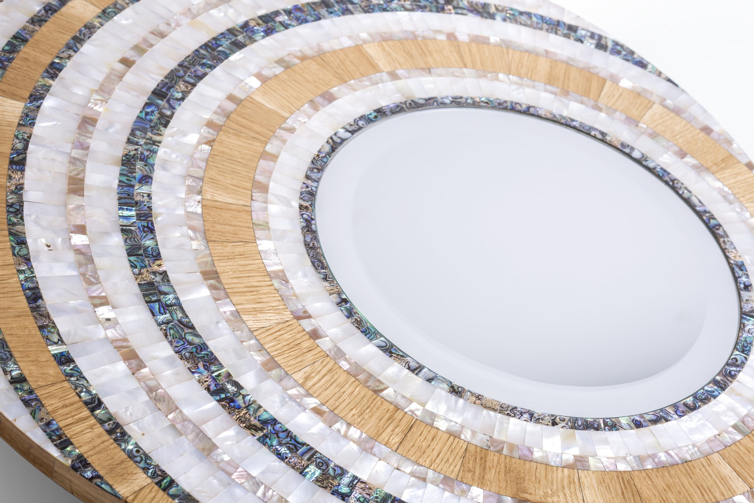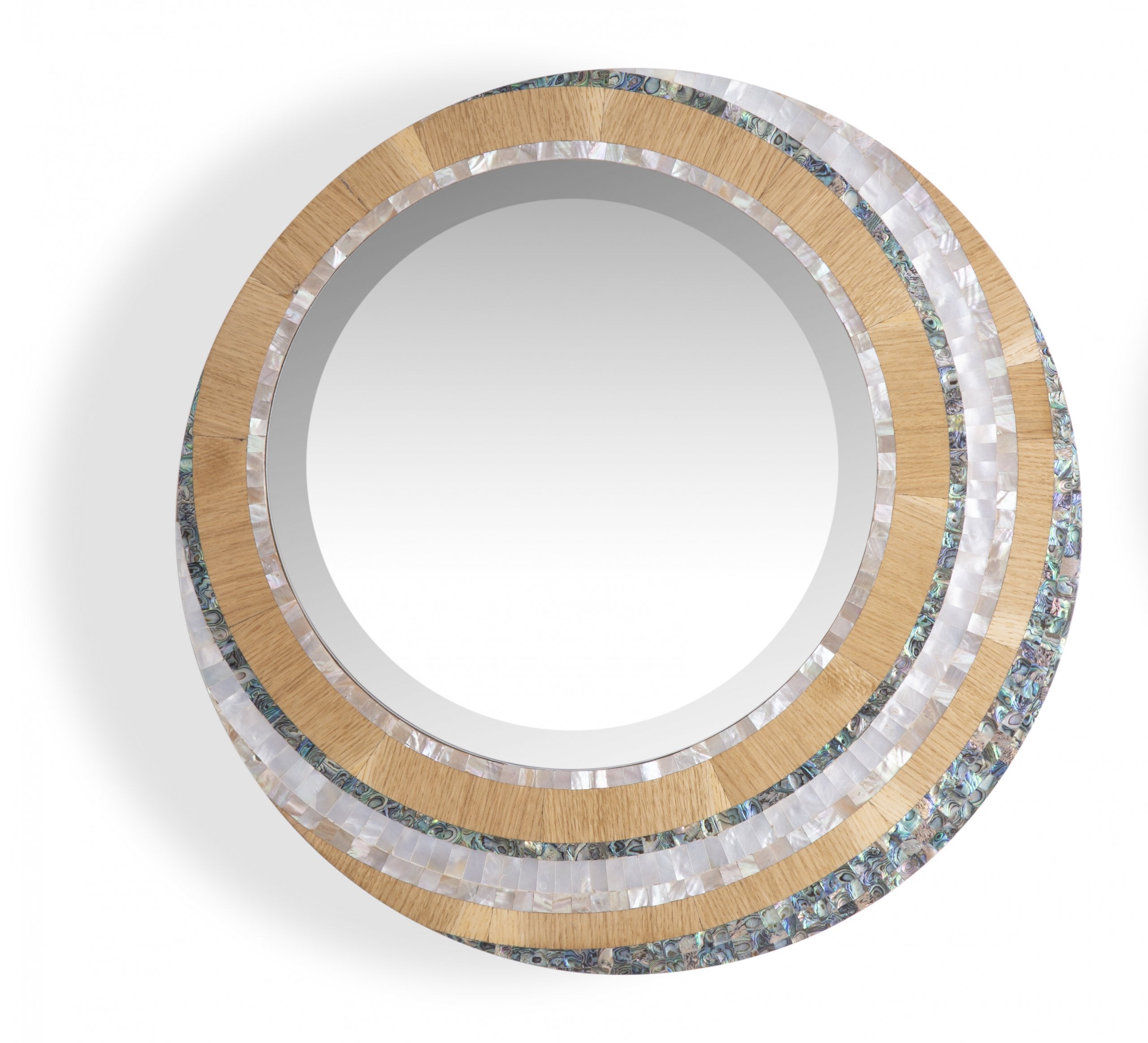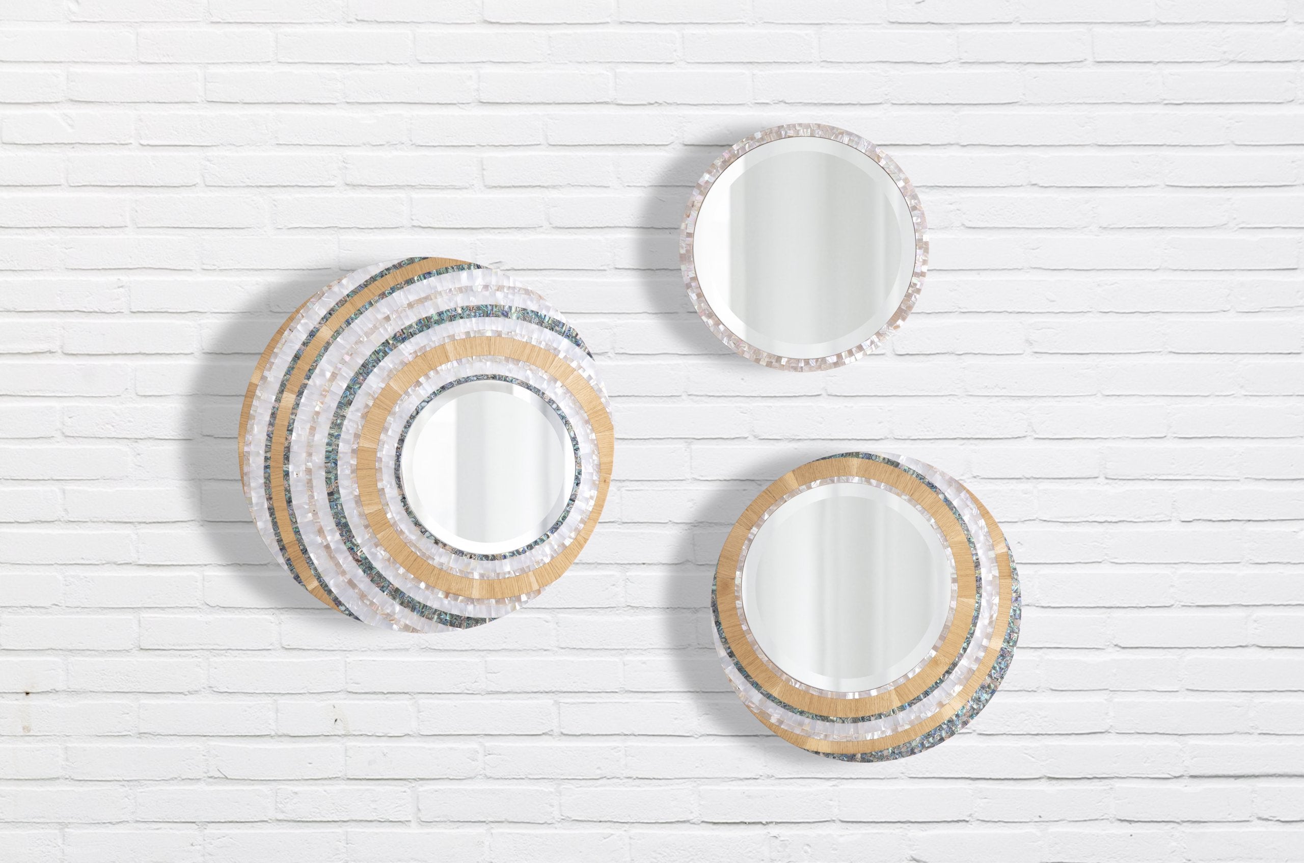 Just like the sun, this trio of mirrors brings rays of warmth and joy to any space. They are intricately designed with three colors of genuine mother-of-pearl and Oak veneer perfectly lined up to radiate from an off-centered mirror, giving a magnetic effect. These mirrors are truly the perfect adornment for any wall.