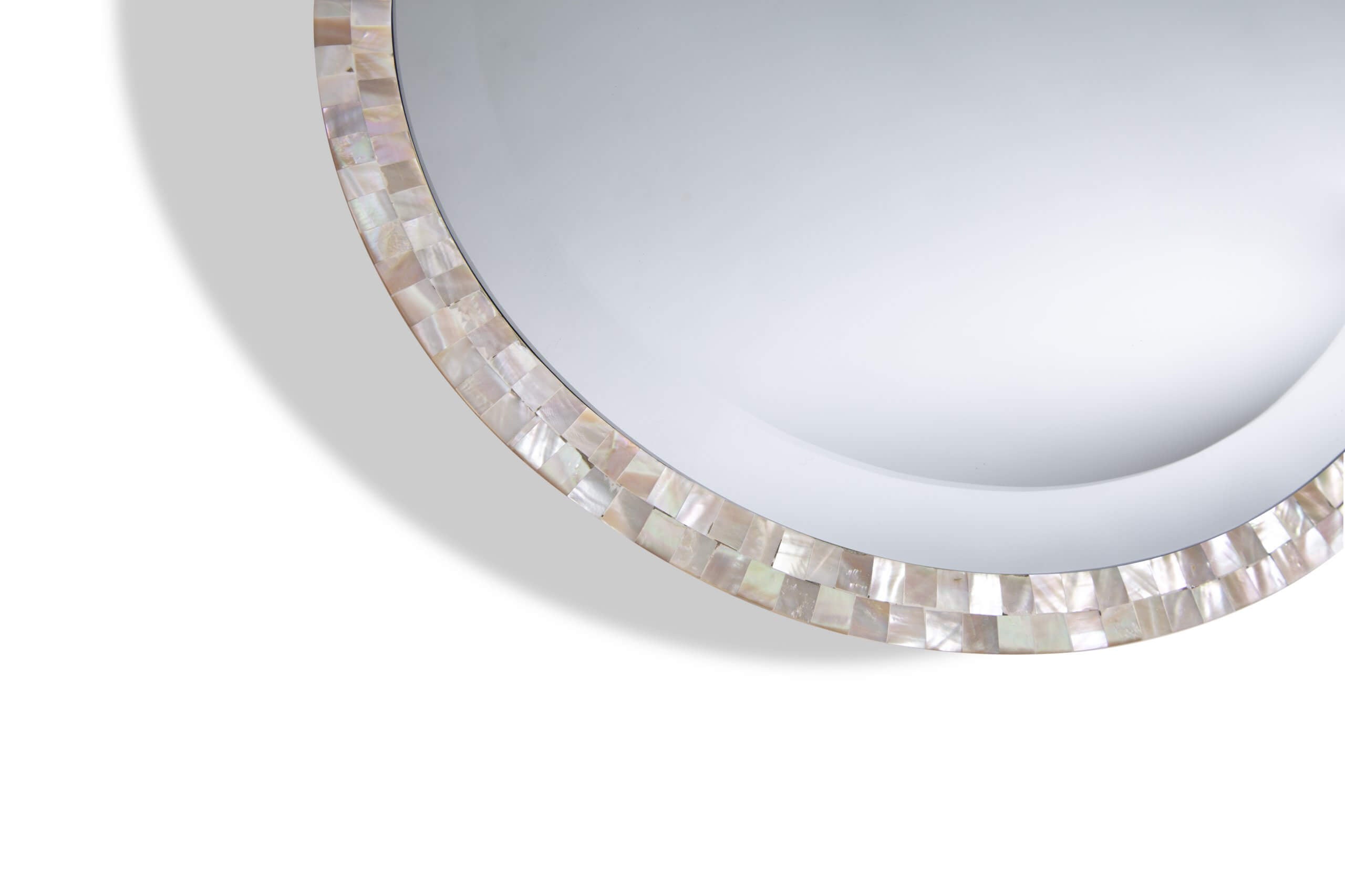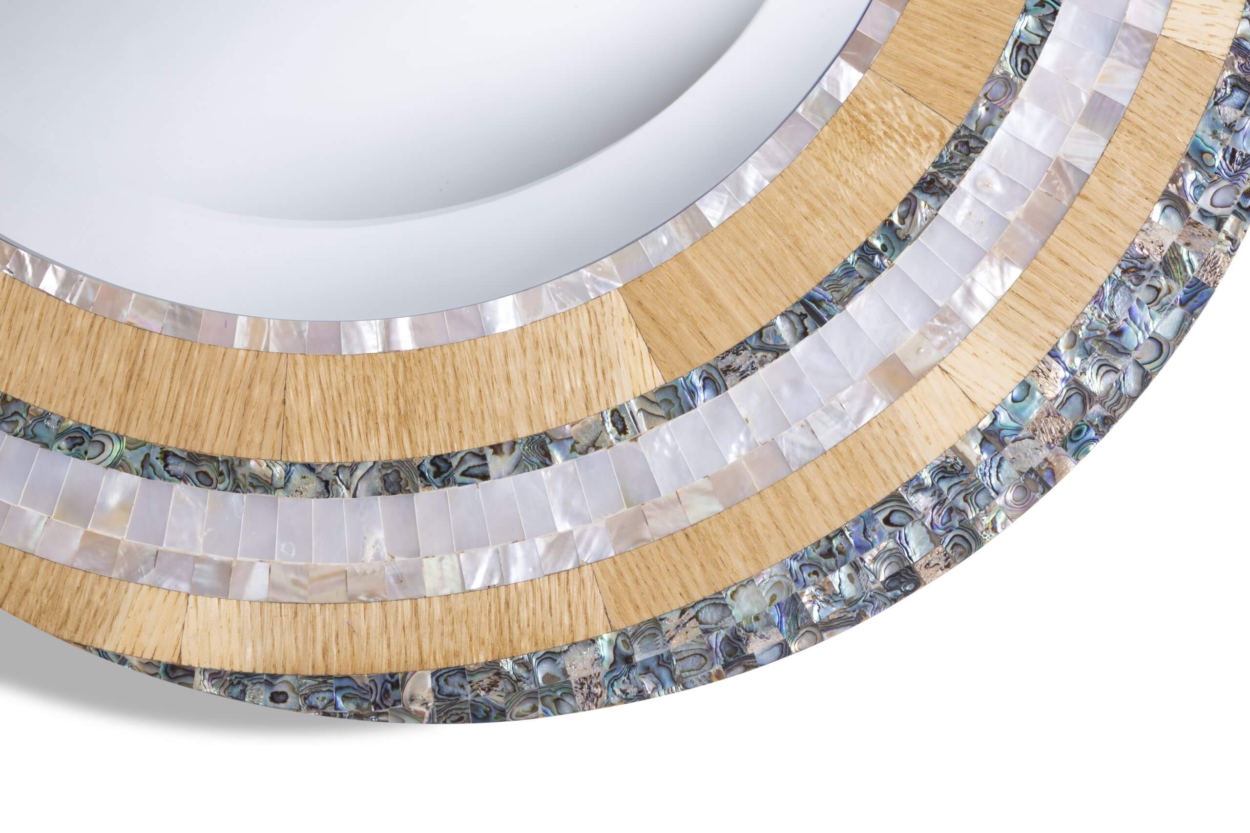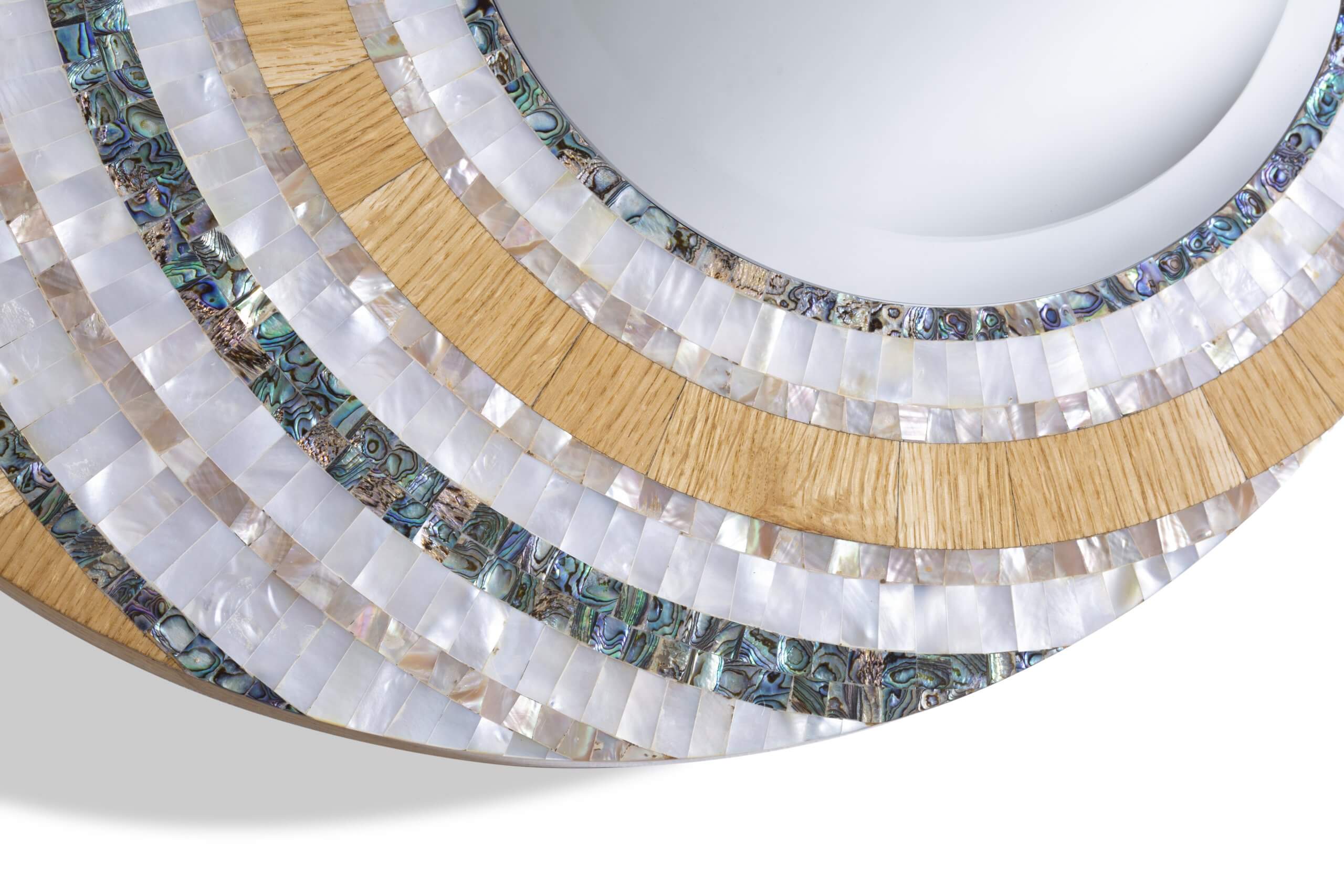 Just like the sun, this trio of mirrors brings rays of warmth and joy to any space. They are intricately designed with three colors of genuine mother-of-pearl and Oak veneer perfectly lined up to radiate from an off-centered mirror, giving a magnetic effect. These mirrors are truly the perfect adornment for any wall.