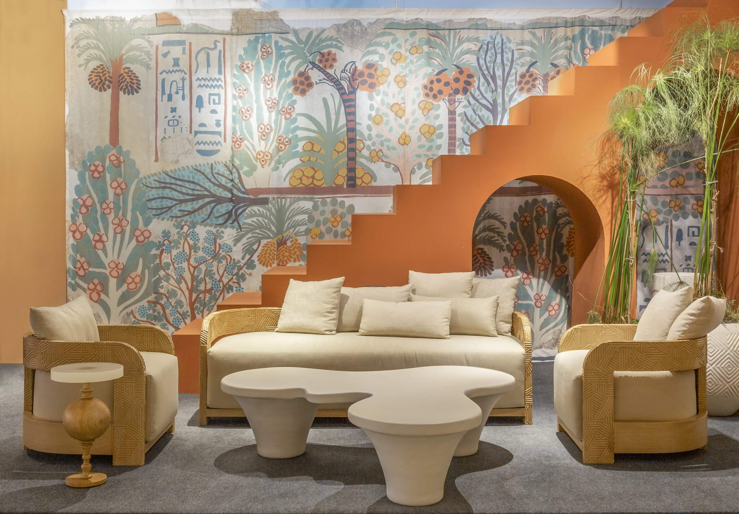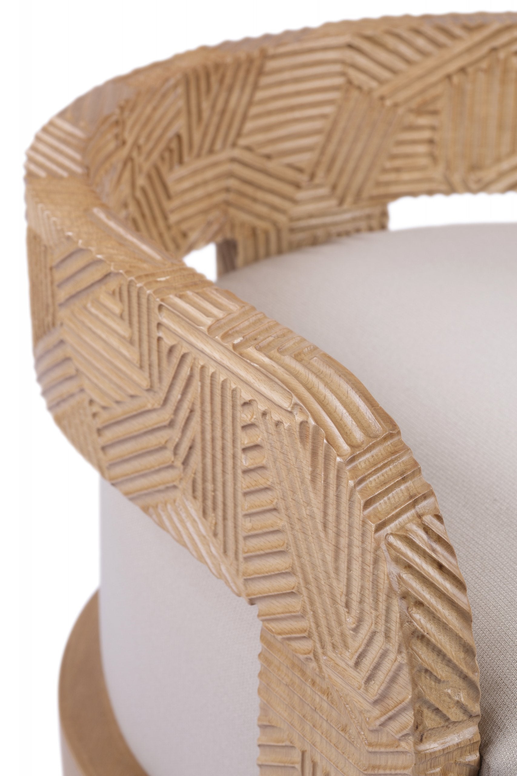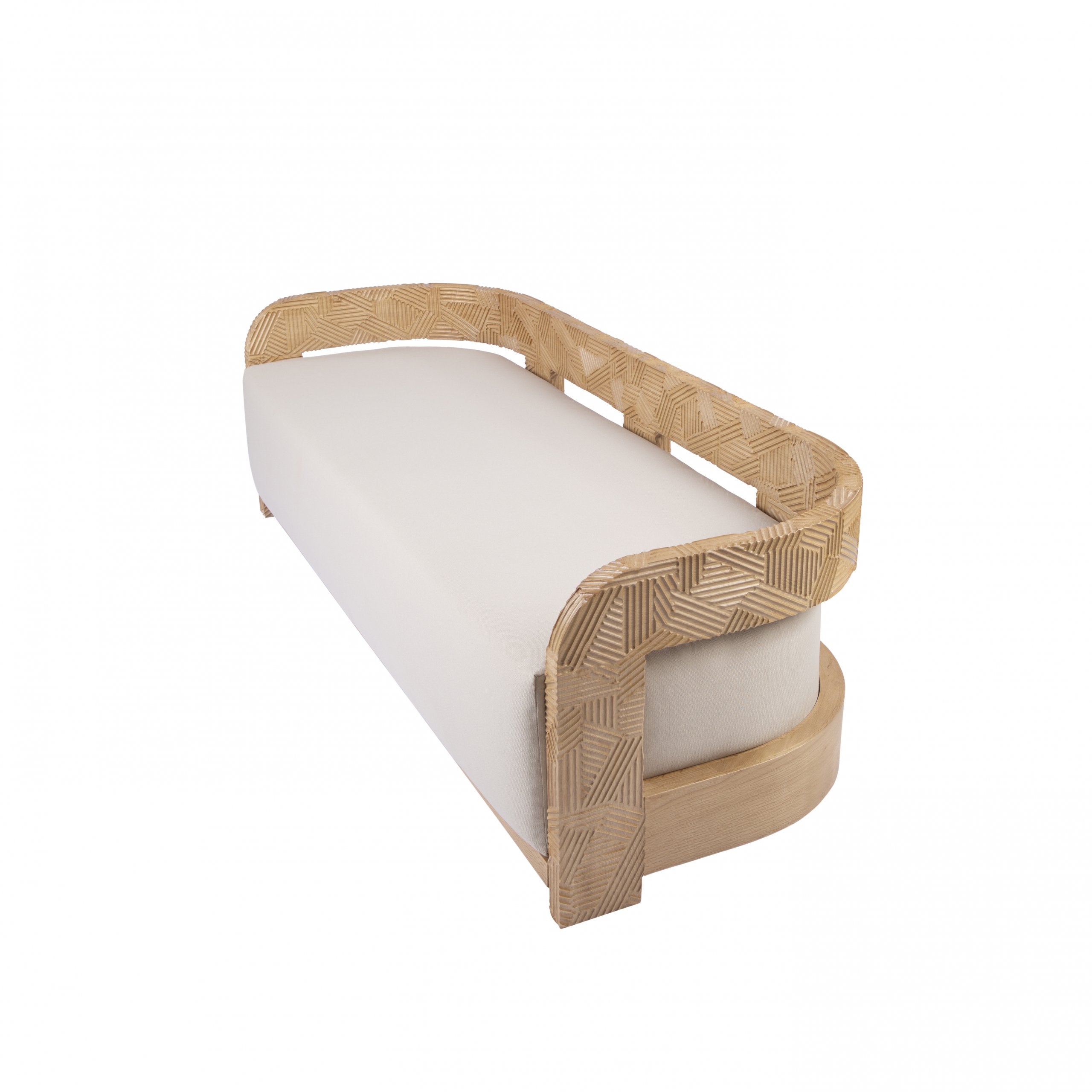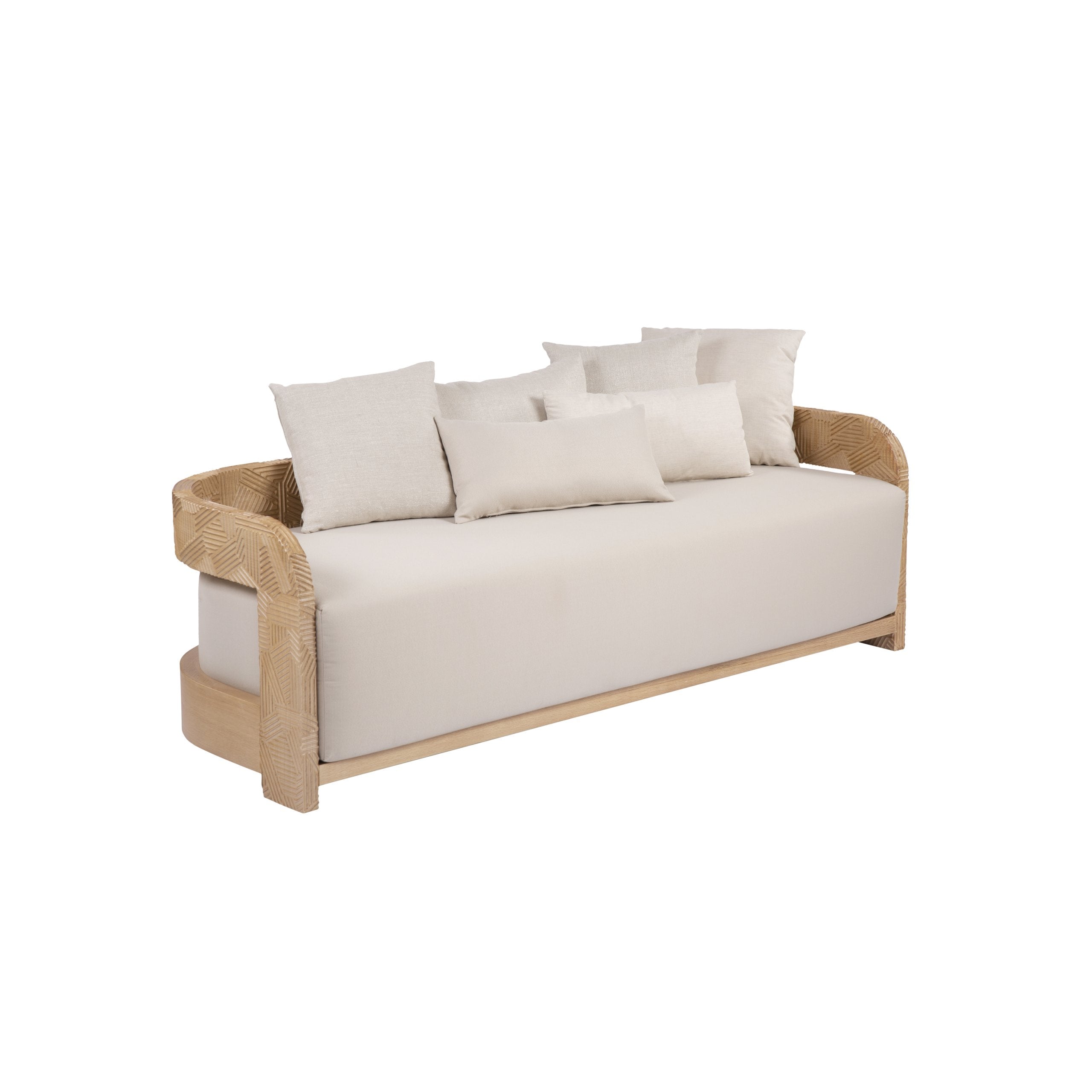 If the feeling of elation were a tangible item, it would be this outdoor sofa. The geometric hand-engraved massive oak frame with its impressively rounded sides gives the impression of a huge hug. The elegantly hidden legs and oversized comfy cushion-top give the impression that you’re truly floating on cloud nine.