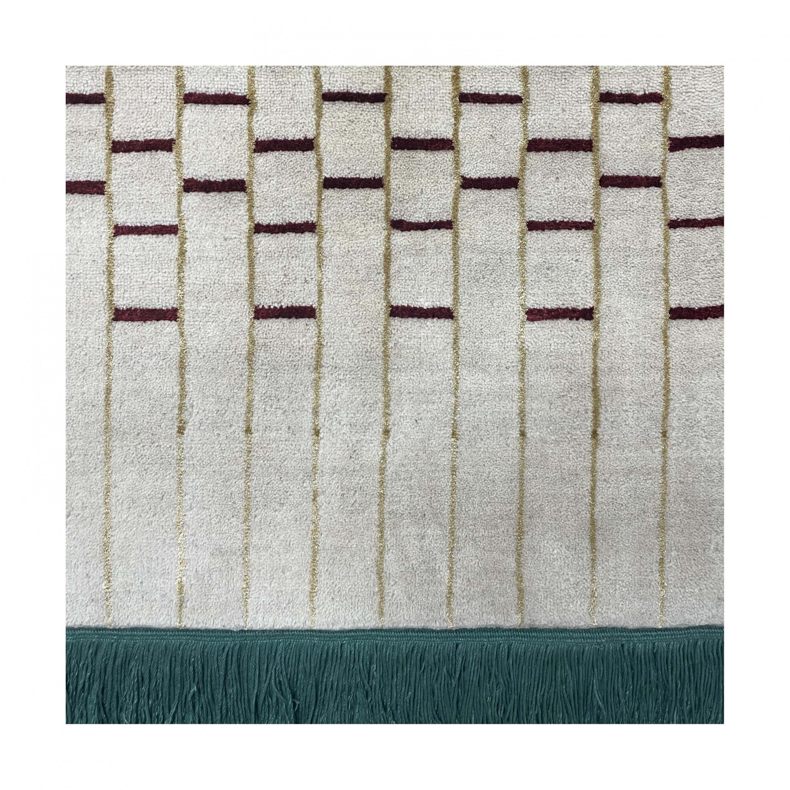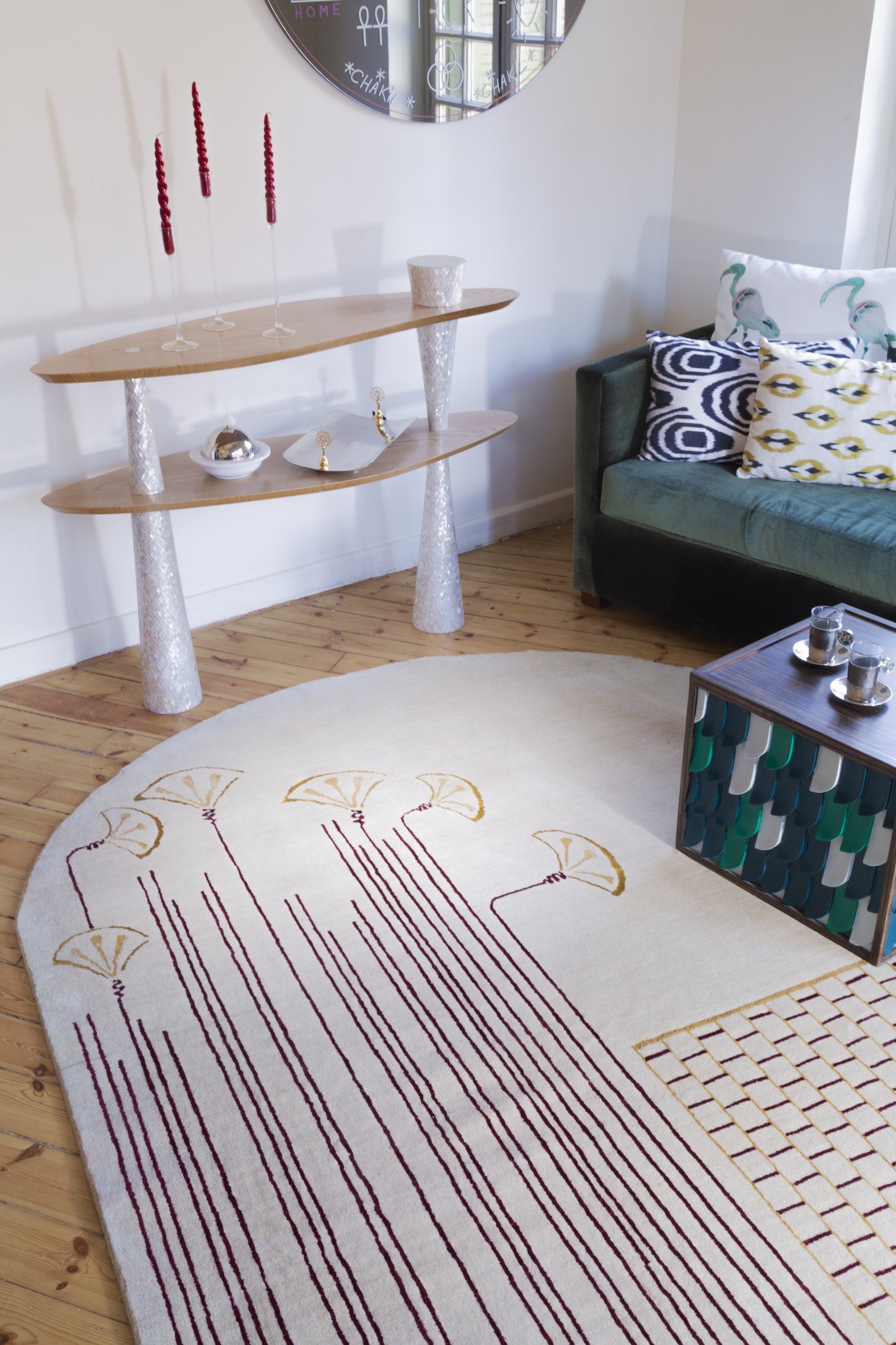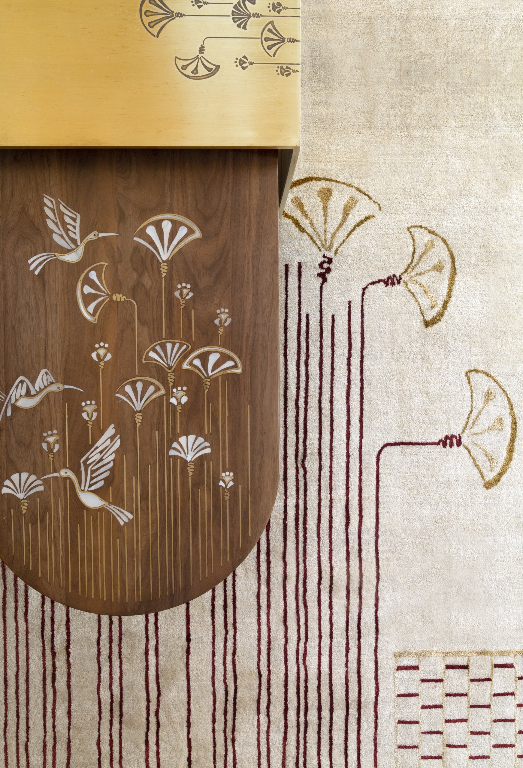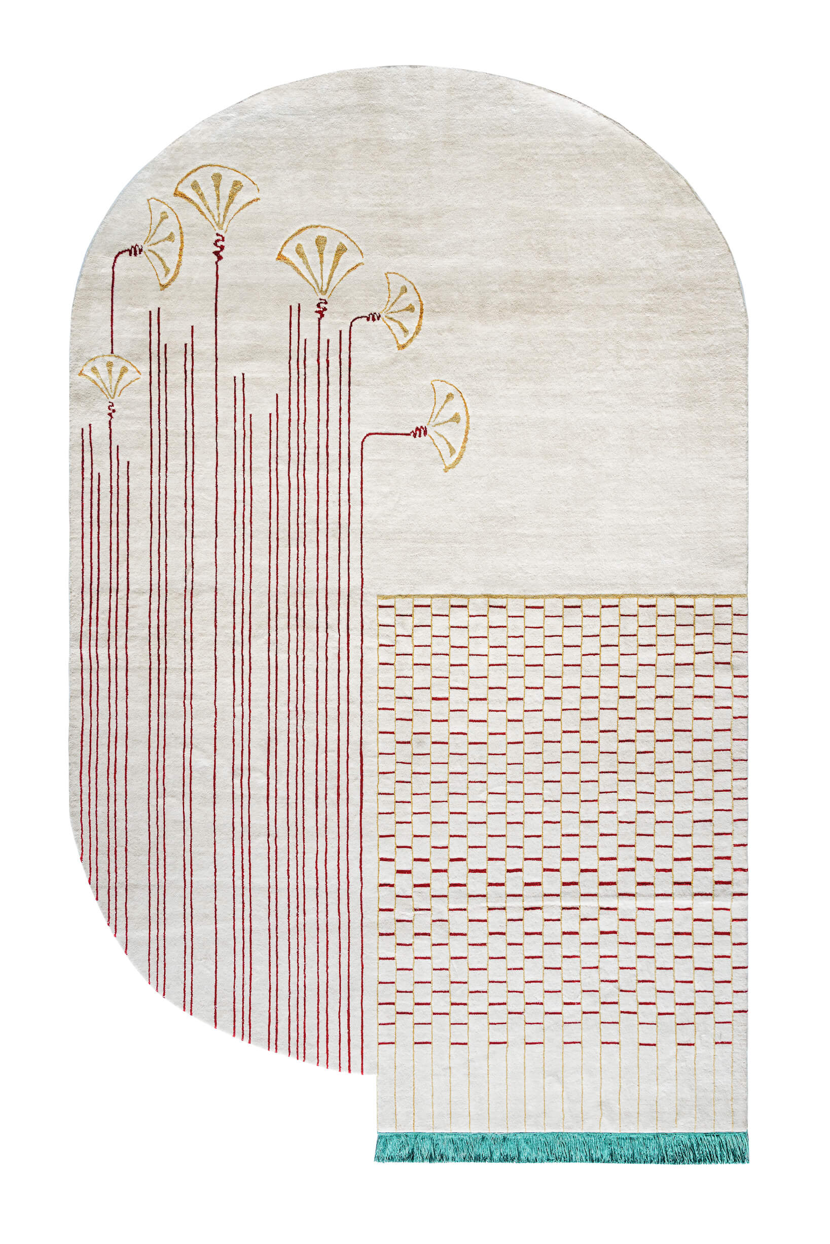 In her debut rug collection, Shewekar adds even more finesse to our beloved Lotus flower by elongating its stems, evoking a sensation of movement, and contrasting it with a simple geometric design and a royal green fringe. The unique cut-out rug is hand-knotted by the best artisans in Egypt, made from 100% Egyptian wool with bamboo silk inlay, with 160,000 knots per square meter.