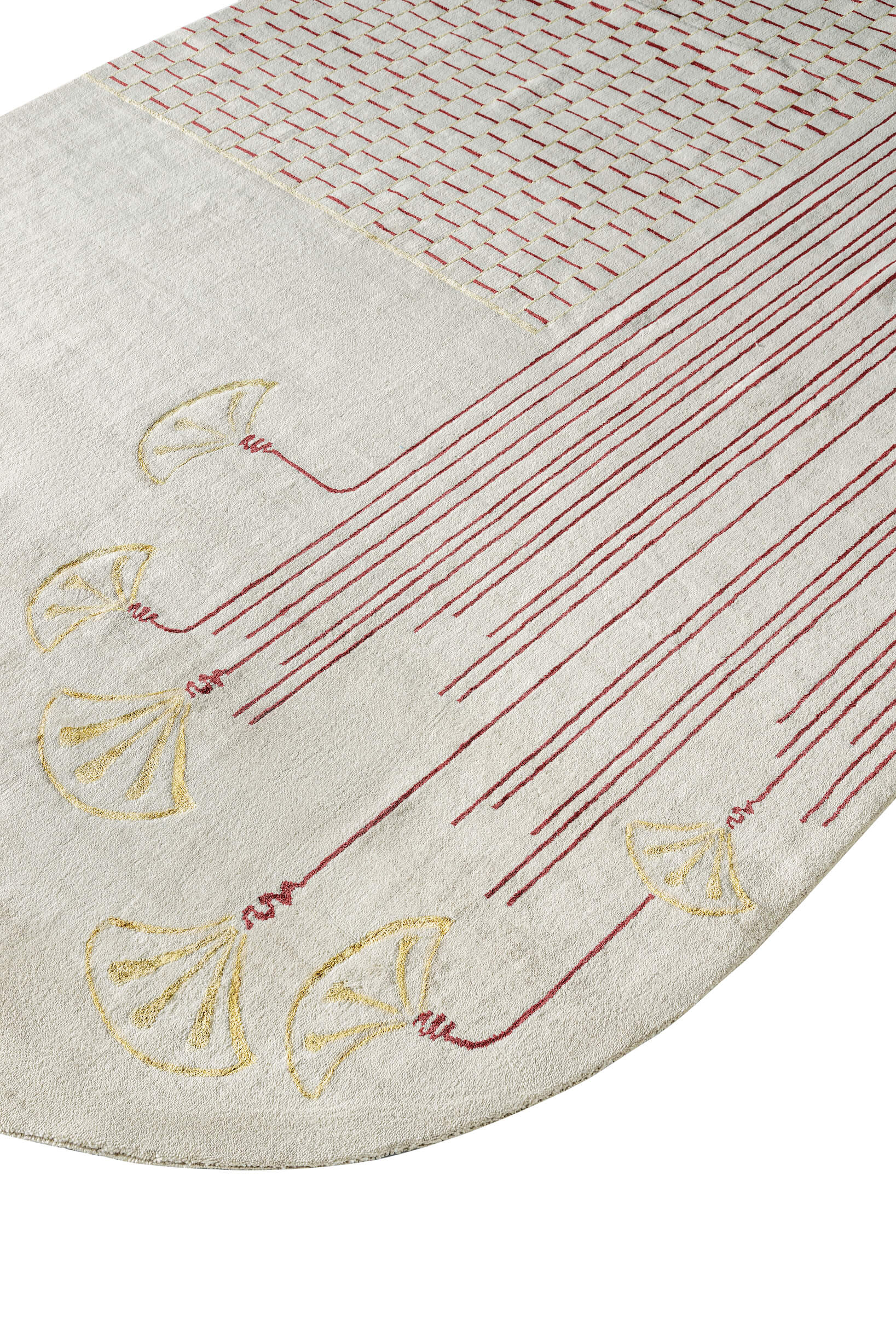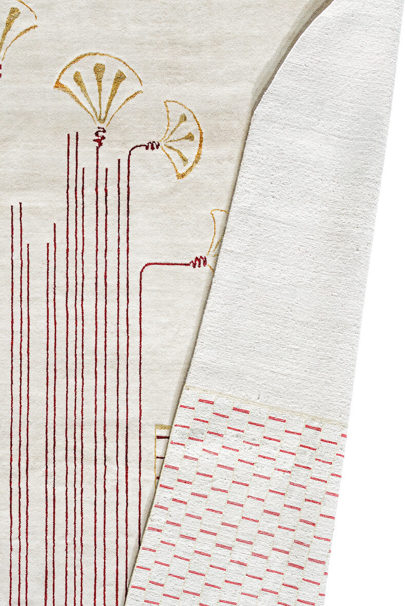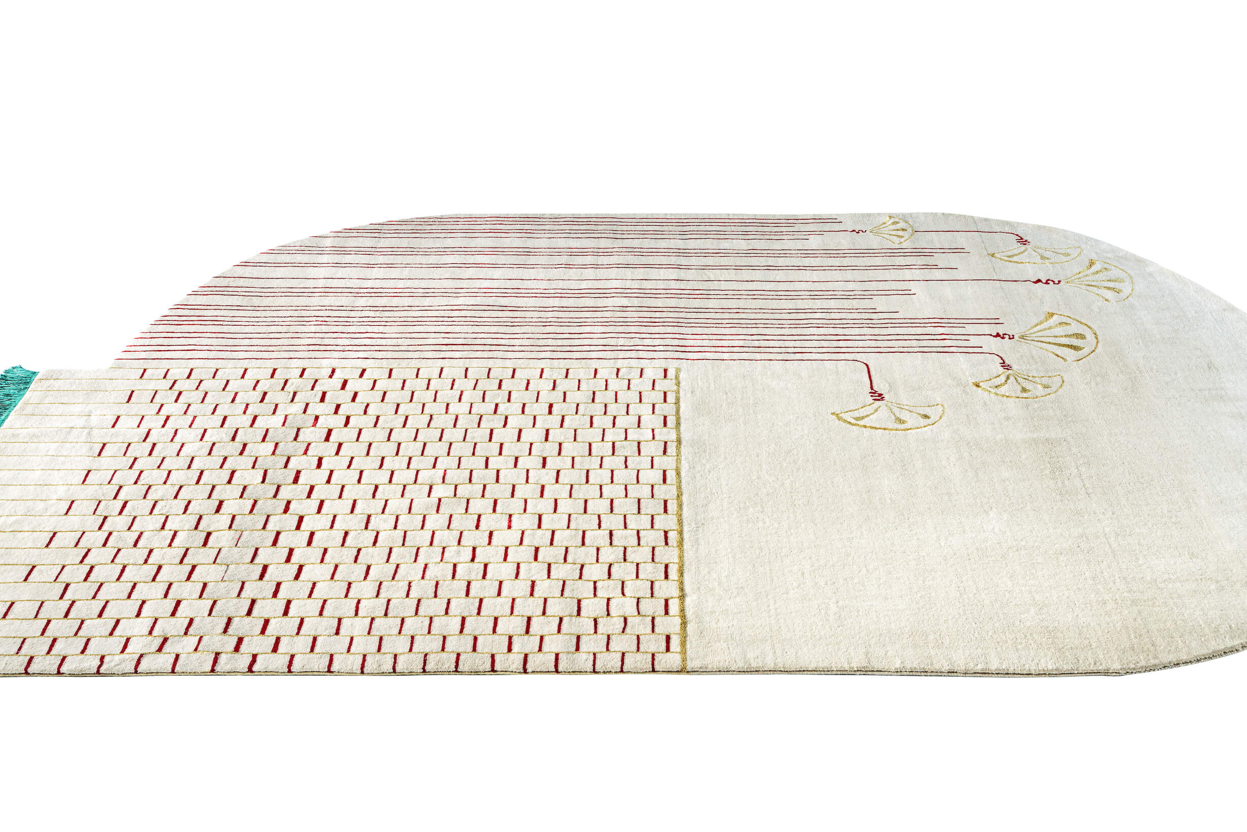In her debut rug collection, Shewekar adds even more finesse to our beloved Lotus flower by elongating its stems, evoking a sensation of movement, and contrasting it with a simple geometric design and a royal green fringe. The unique cut-out rug is hand-knotted by the best artisans in Egypt, made from 100% Egyptian wool with bamboo silk inlay, with 160,000 knots per square meter.