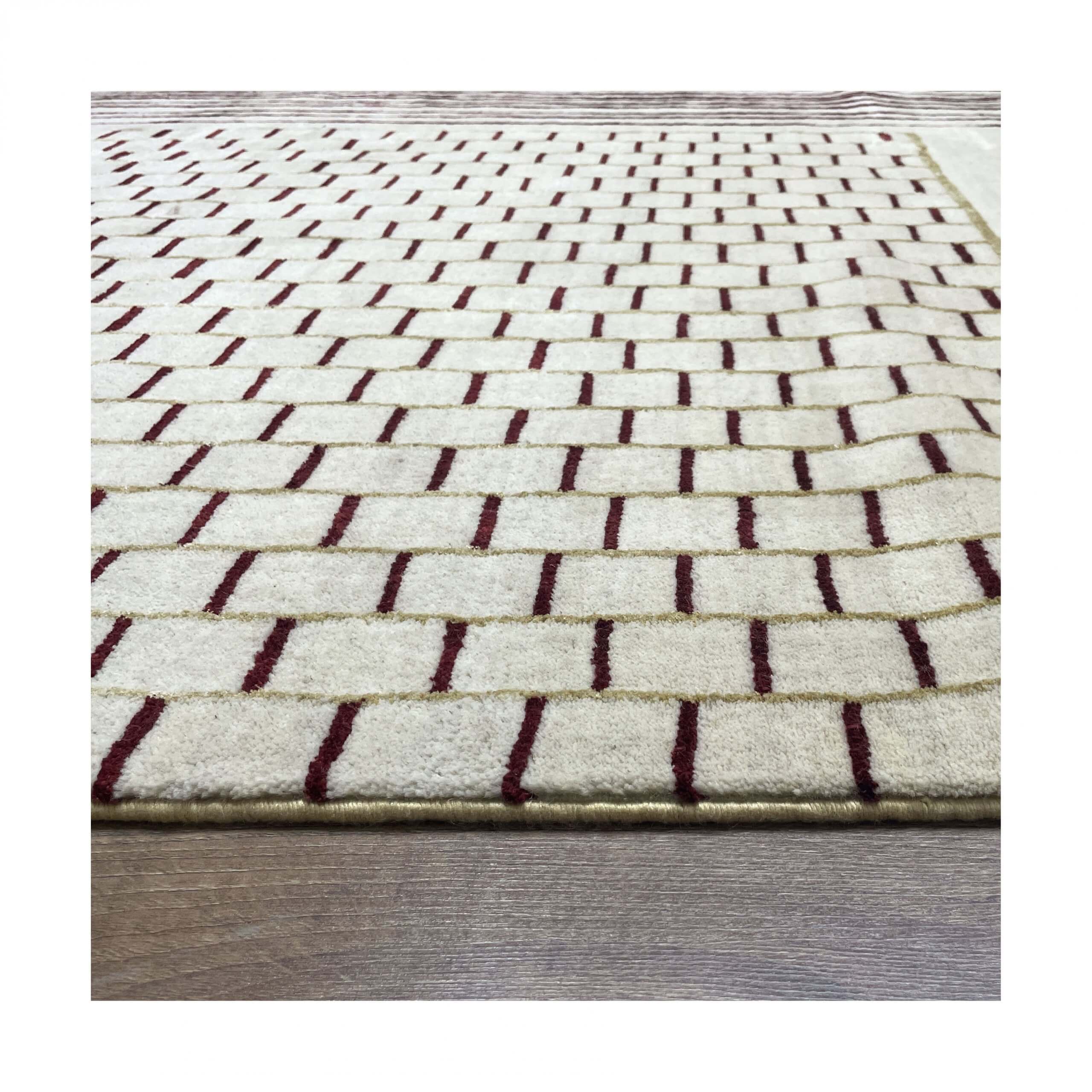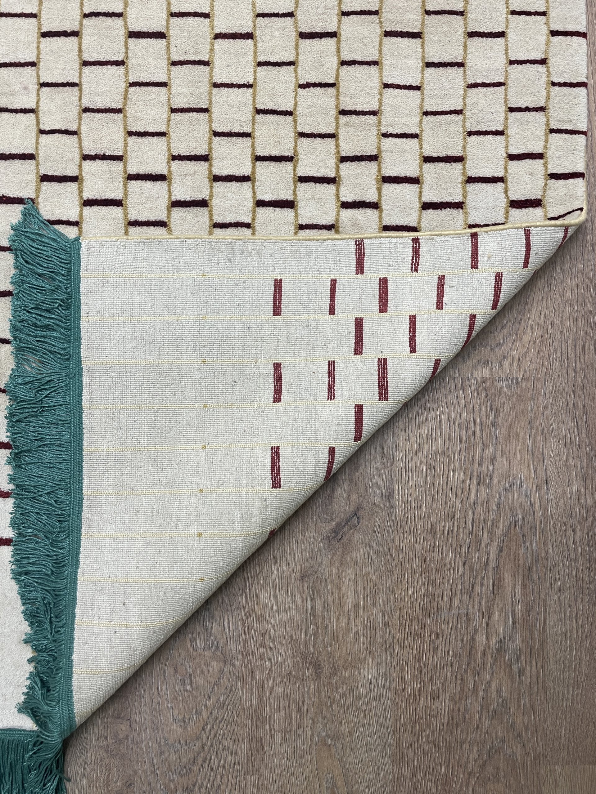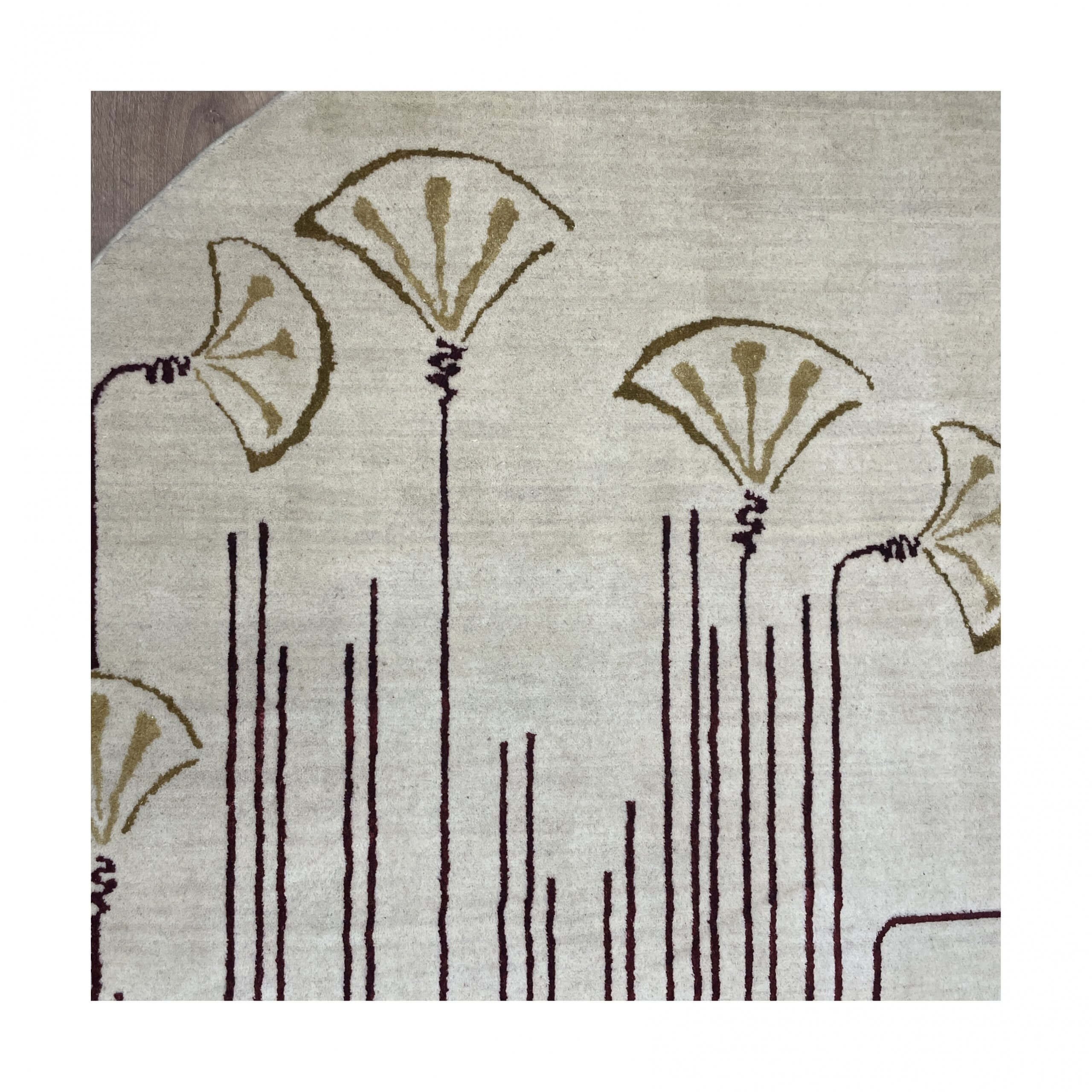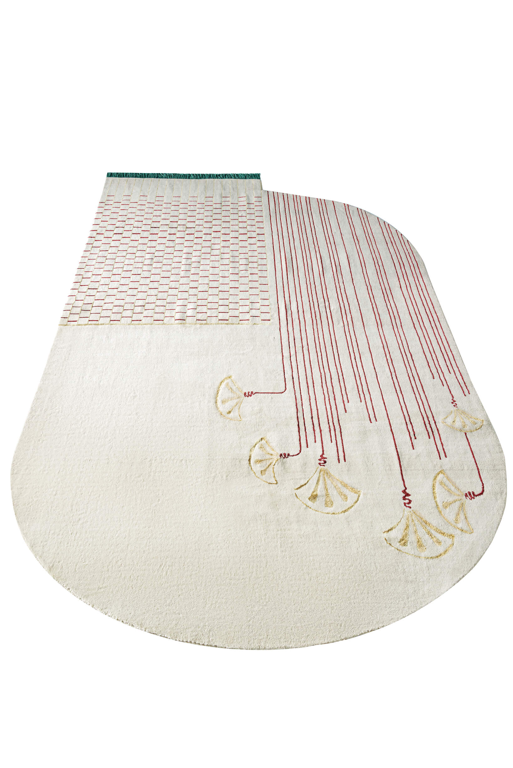 In her debut rug collection, Shewekar adds even more finesse to our beloved Lotus flower by elongating its stems, evoking a sensation of movement, and contrasting it with a simple geometric design and a royal green fringe. The unique cut-out rug is hand-knotted by the best artisans in Egypt, made from 100% Egyptian wool with bamboo silk inlay, with 160,000 knots per square meter.