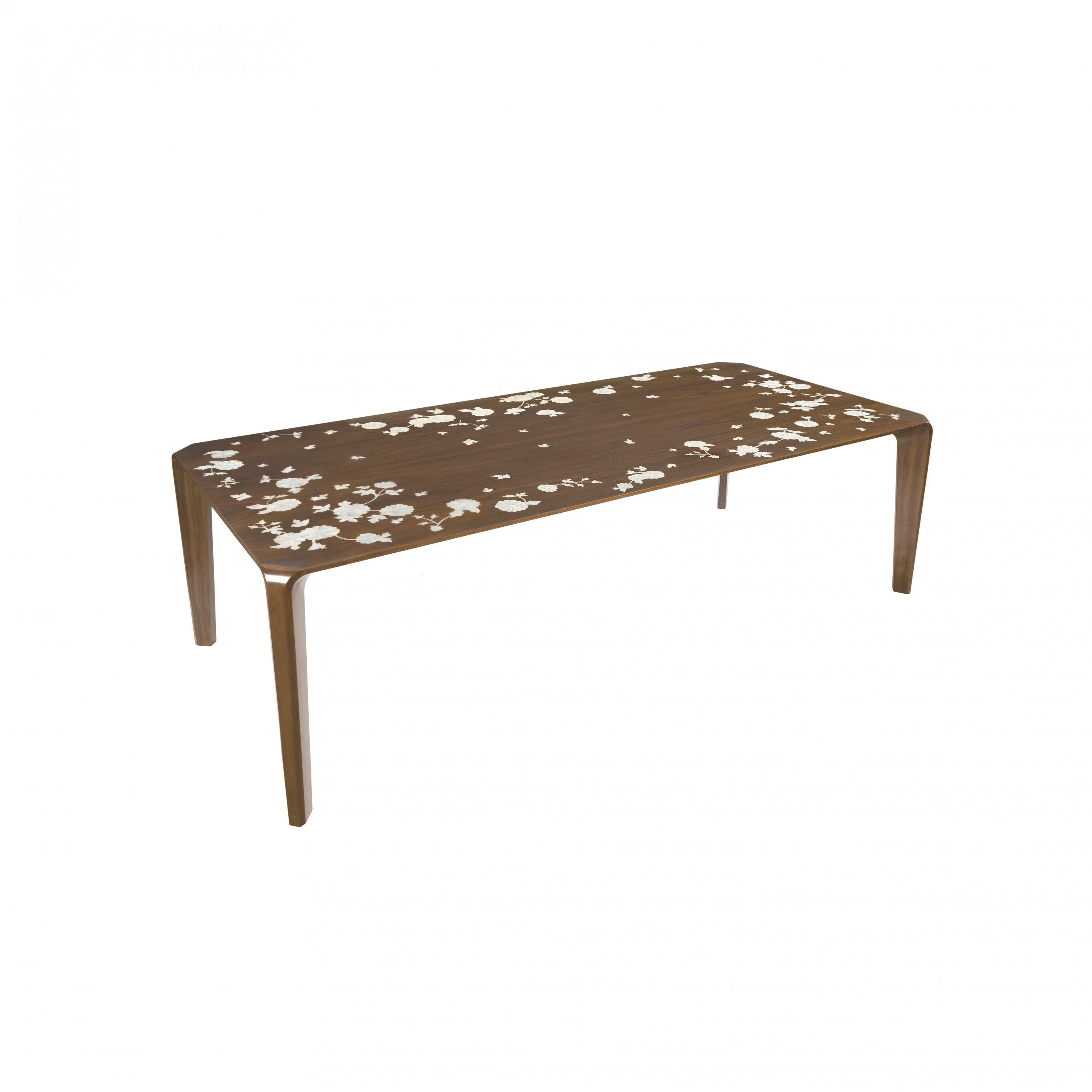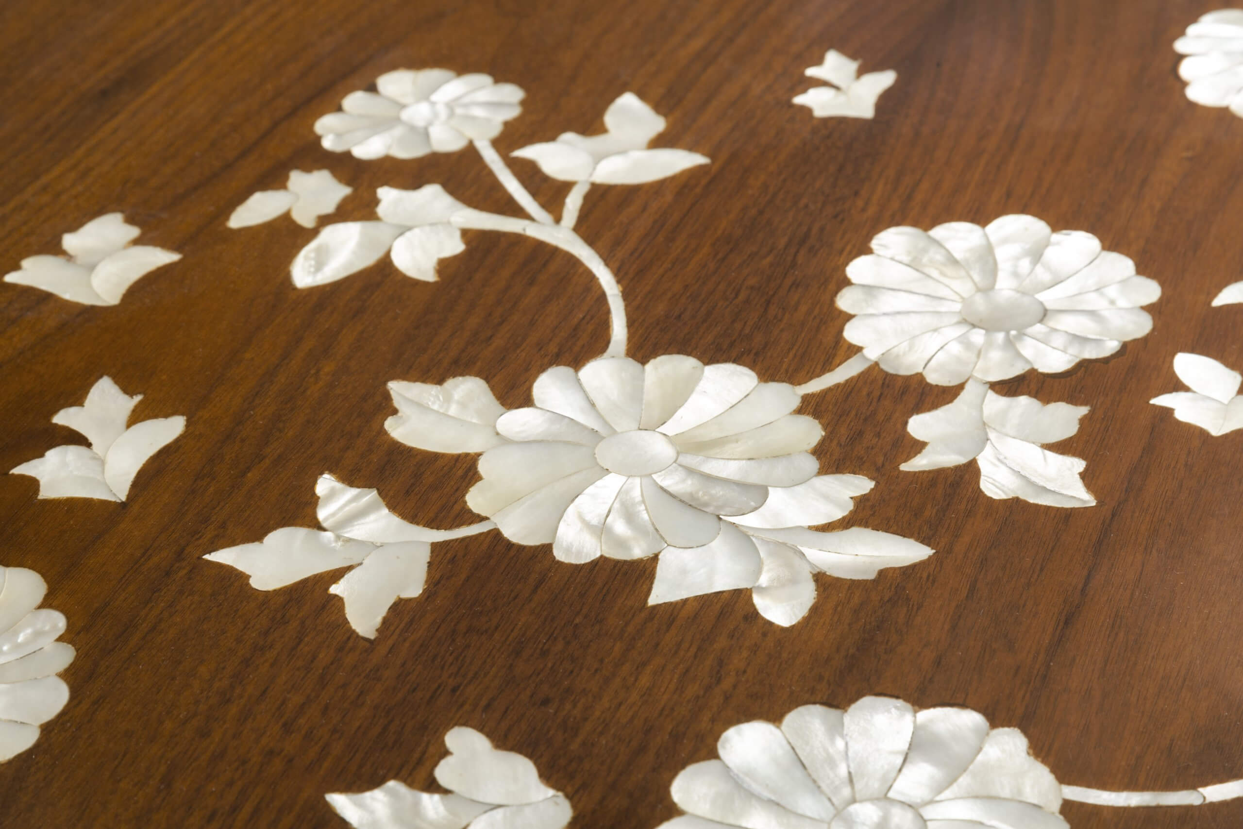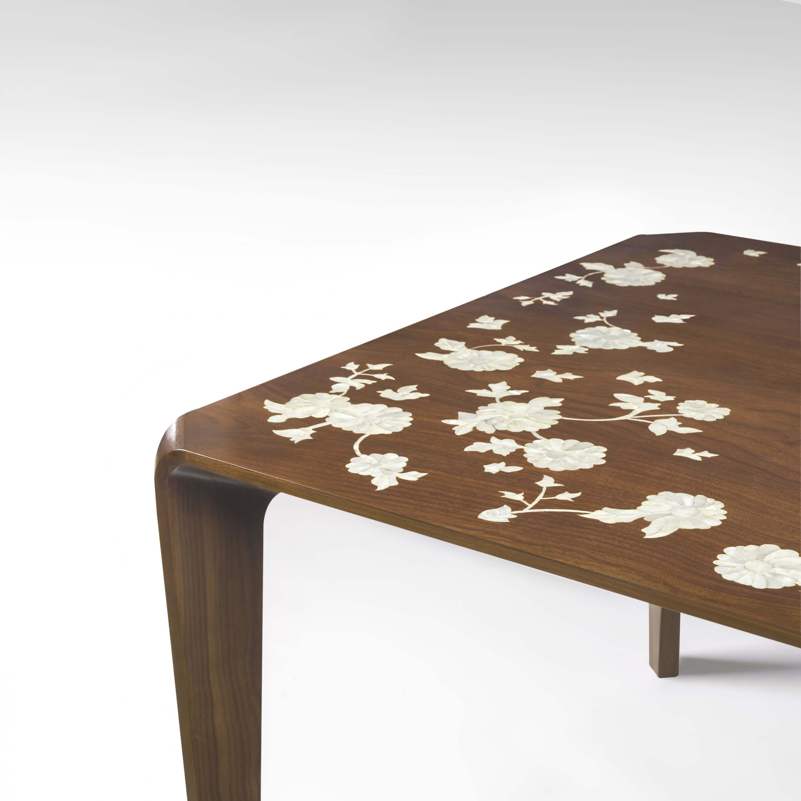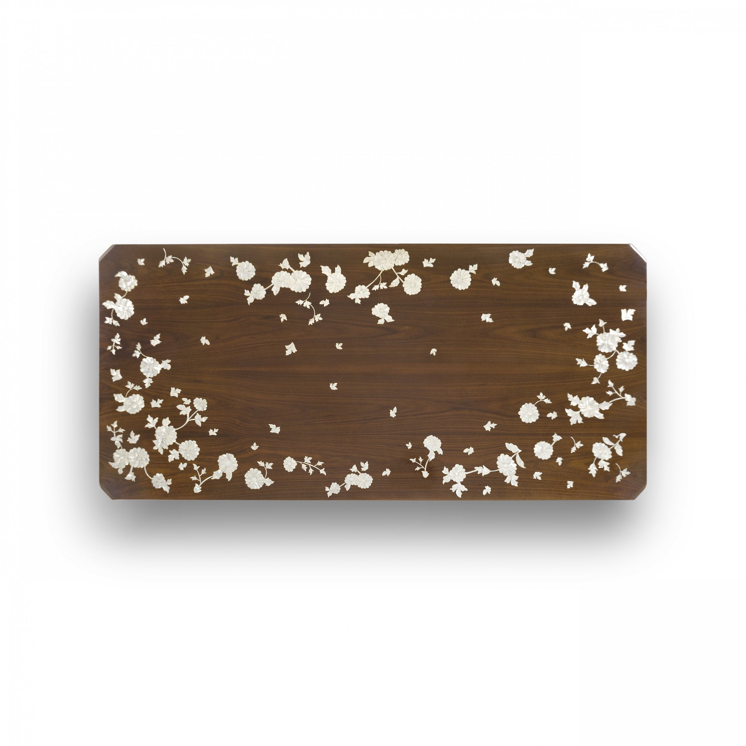 Our best-selling design in yet another masterpiece. This beauty is made of a massive walnut wood top and hand-laid genuine mother-of-pearl, in a delicate asymmetric floral pattern. There is no better place to gather around than your dining table, and this one is sure to warm up your space and hearts.