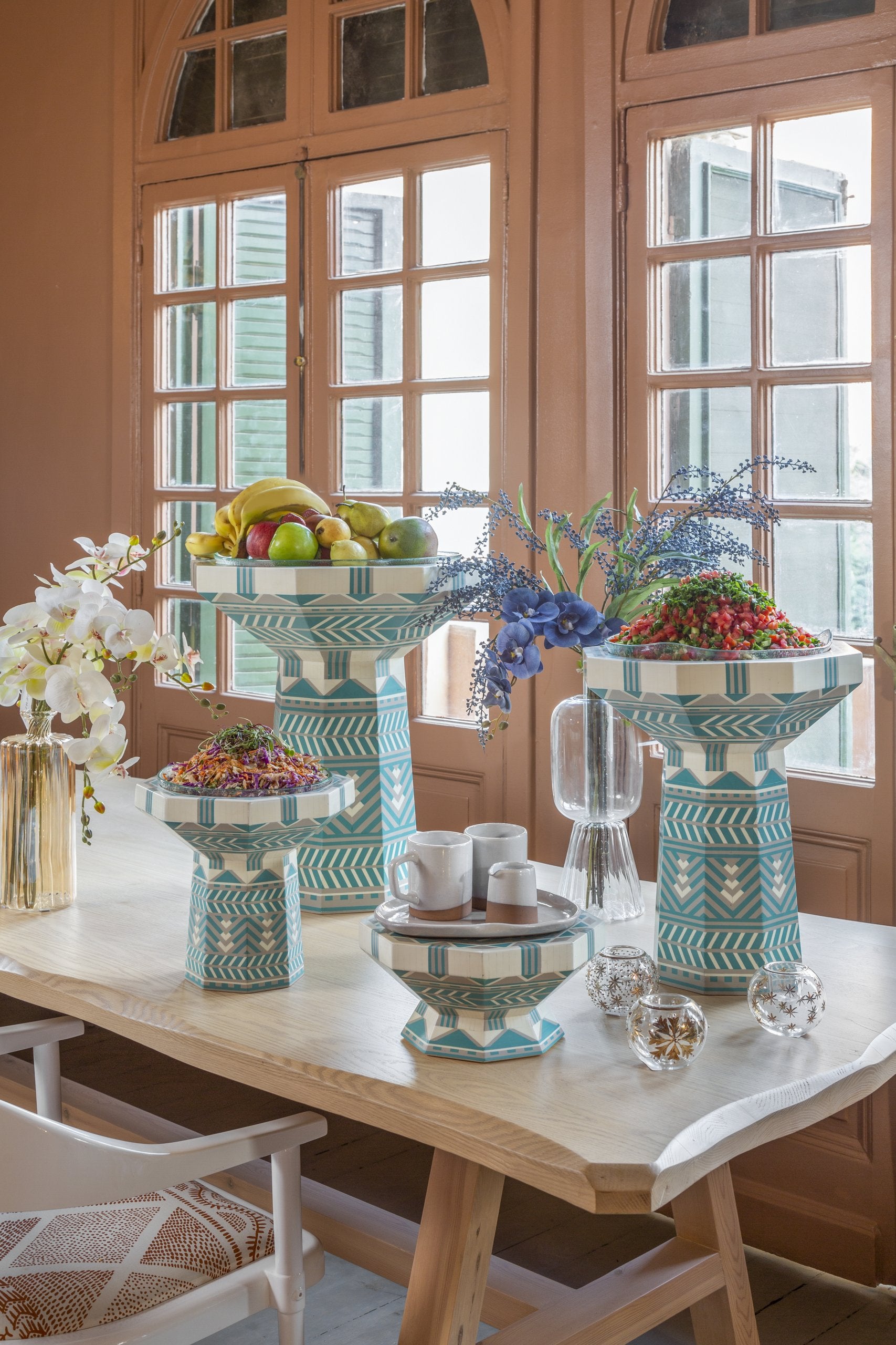 This is how feasts are made! Hosting is not just about the food, but the joy, warmth, scents, colors and overall presentation of your love for the people want to share those moments with. The Gala hosting set is all hand-made of custom-colored acrylic. It is truly a labor of love and passion. The hand-blown glass platters are food-safe and can be used to serve food straight into them, or for fruits, flowers and candles. They come in 4 different sizes and 5 colors that can be mixed and matched for a colorful fun experience, or used separately for a more subtle and elegant gathering. The larger size can also be used as a side table.