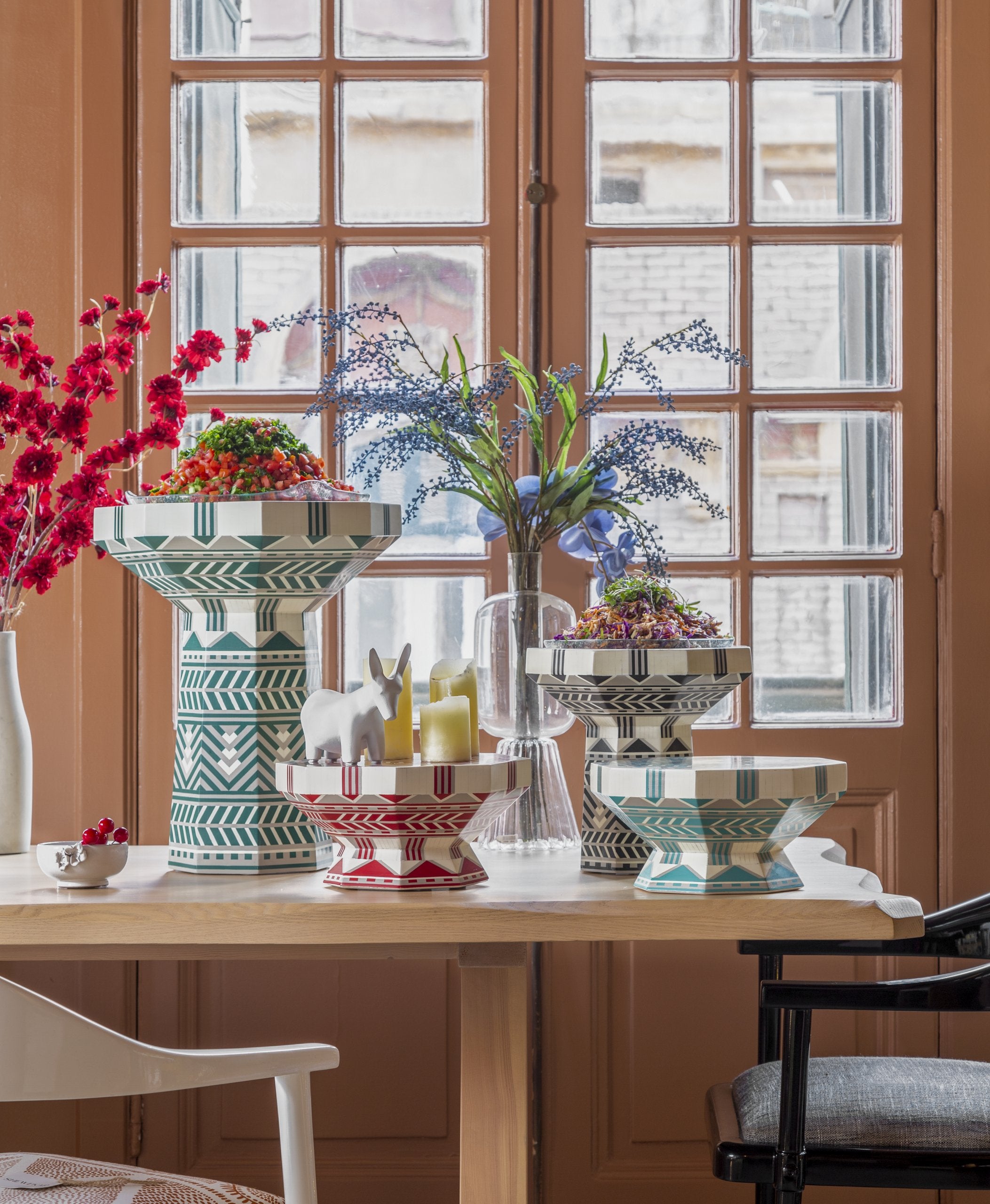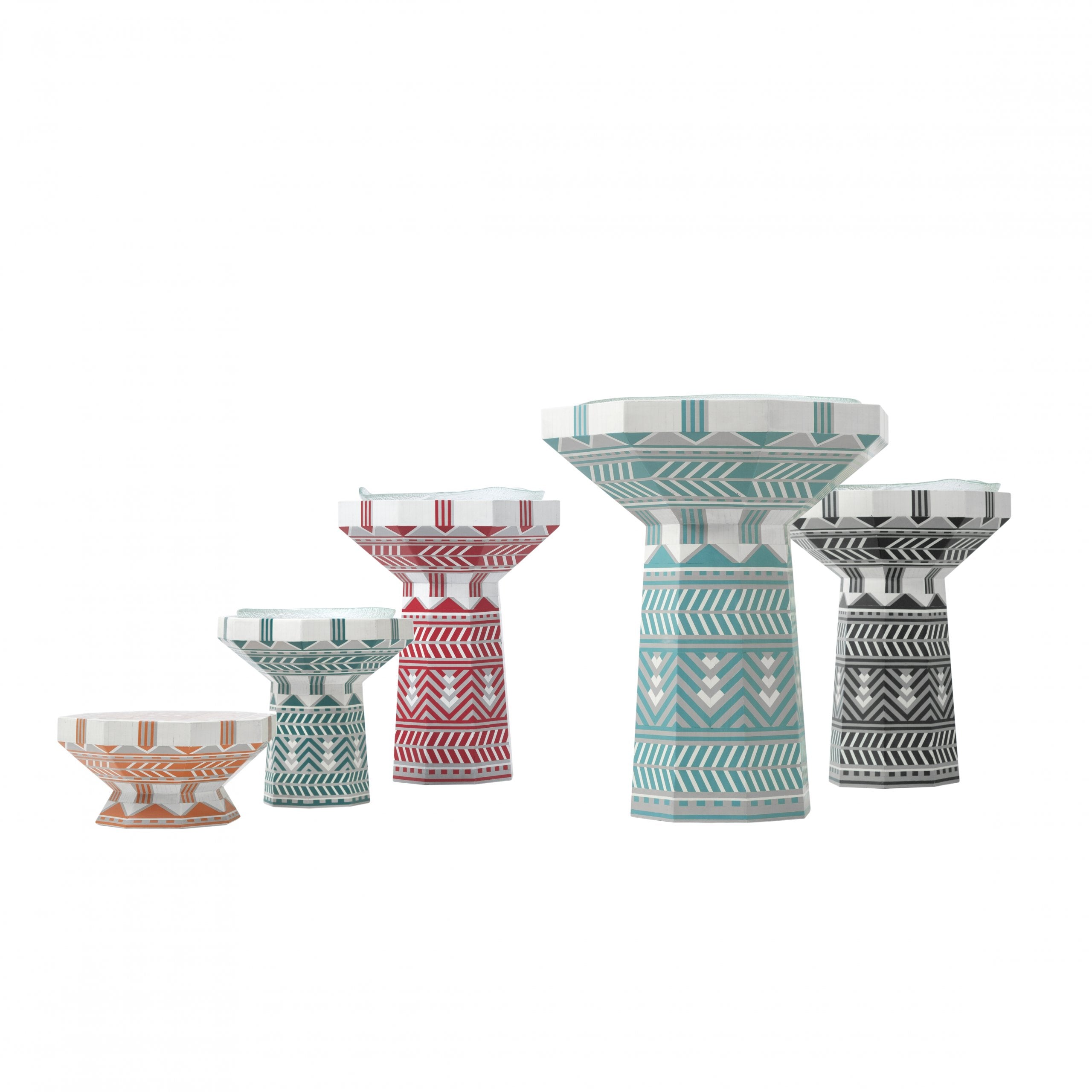 This is how feasts are made! Hosting is not just about the food, but the joy, warmth, scents, colors, and overall presentation of your love for the people you want to share those moments with. The Gala hosting set is all handmade of custom-colored acrylic. It is truly a labor of love and passion. The hand-blown glass platters are food-safe and can be used to serve food straight into them, or for fruits, flowers, and candles. They come in four different sizes and five colors that can be mixed and matched for a colorful, fun experience, or used separately for a more subtle and elegant gathering. The larger size can also be used as a side table.