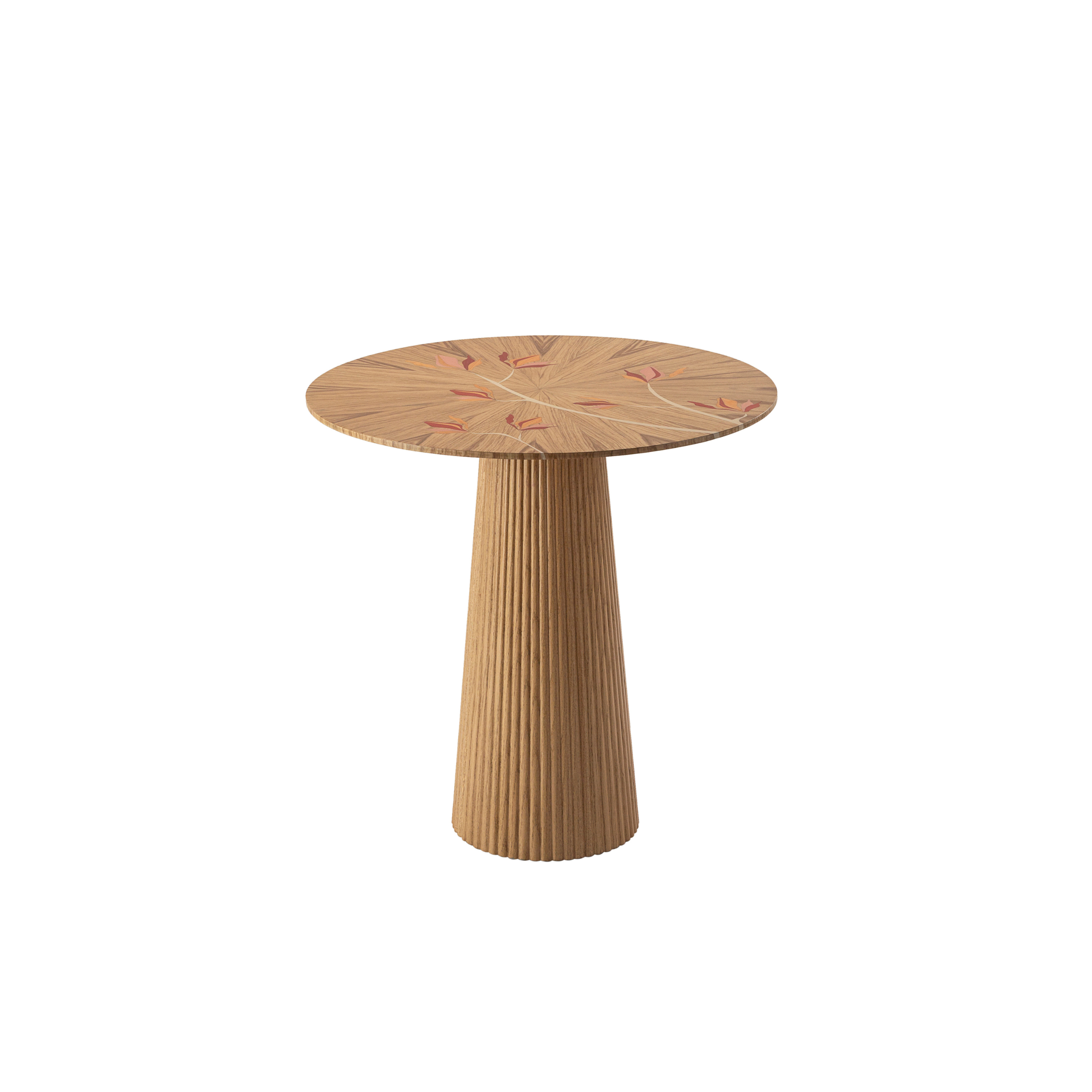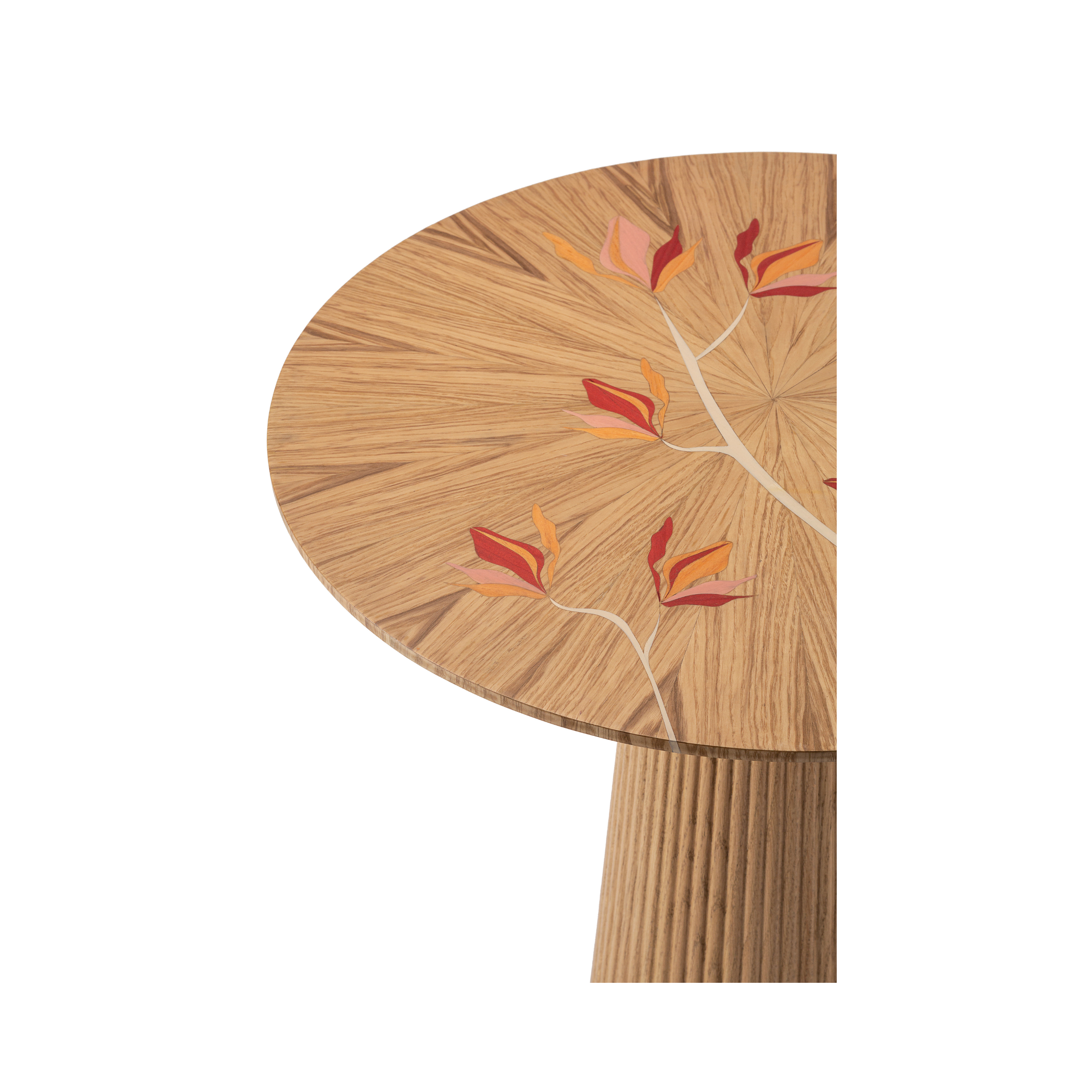 A blooming table that would remind you of the fresh spring breeze. The top features a delicate floral design, hand-laid with vibrant and colorful veneer while the base is crafted from hand-laid strips of oak wood, adding a touch of artisanal craftsmanship and natural elegance.