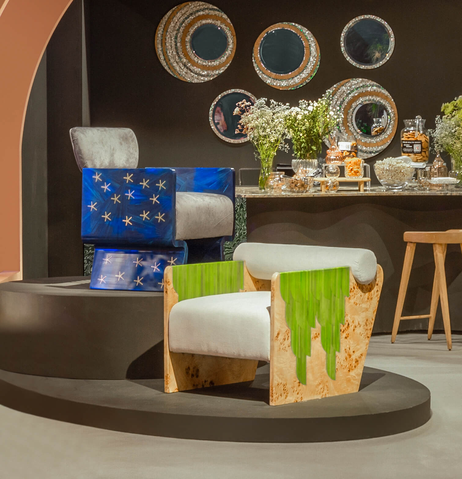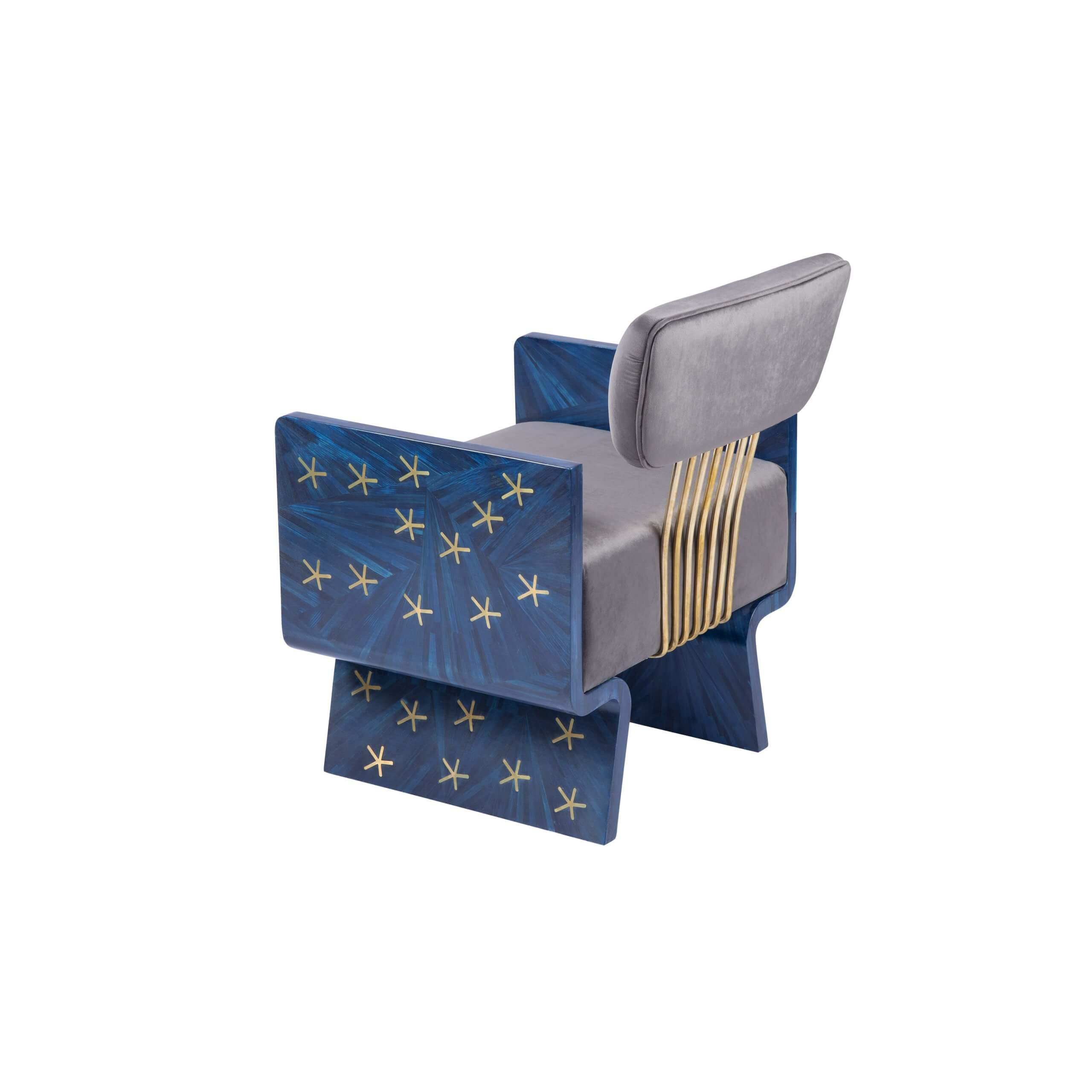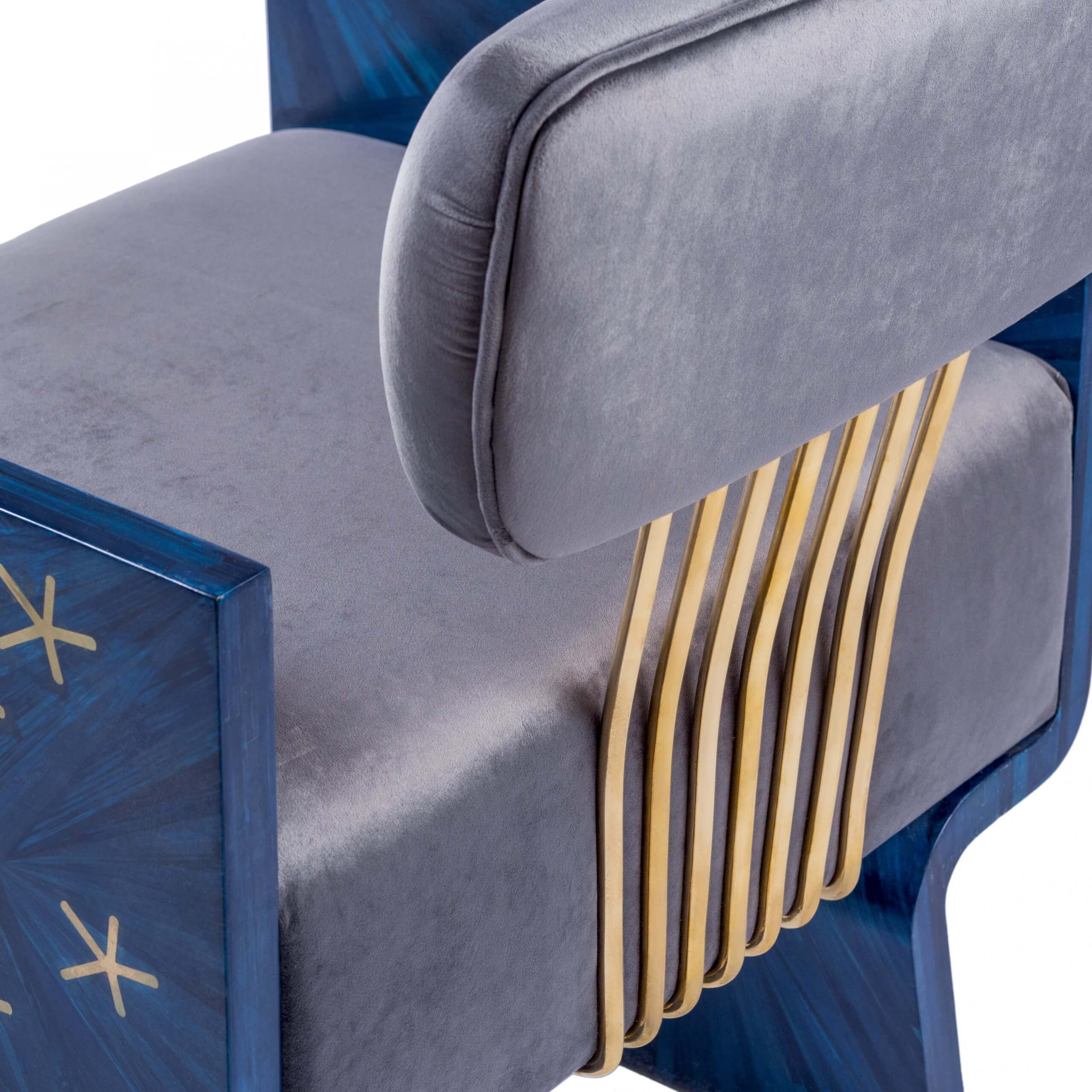 Inspired by Nut, the Egyptian celestial goddess of the sky. The brass stars glimmer, contrasting against the deep blue Straw, highlighting the striking beauty of this piece. This original design piece is suitable for various uses around the home and is certain to add class to any setting. Kindly take your seat among the stars in this fabulous signature Shewekar-Straw, brass, and upholstery armchair.