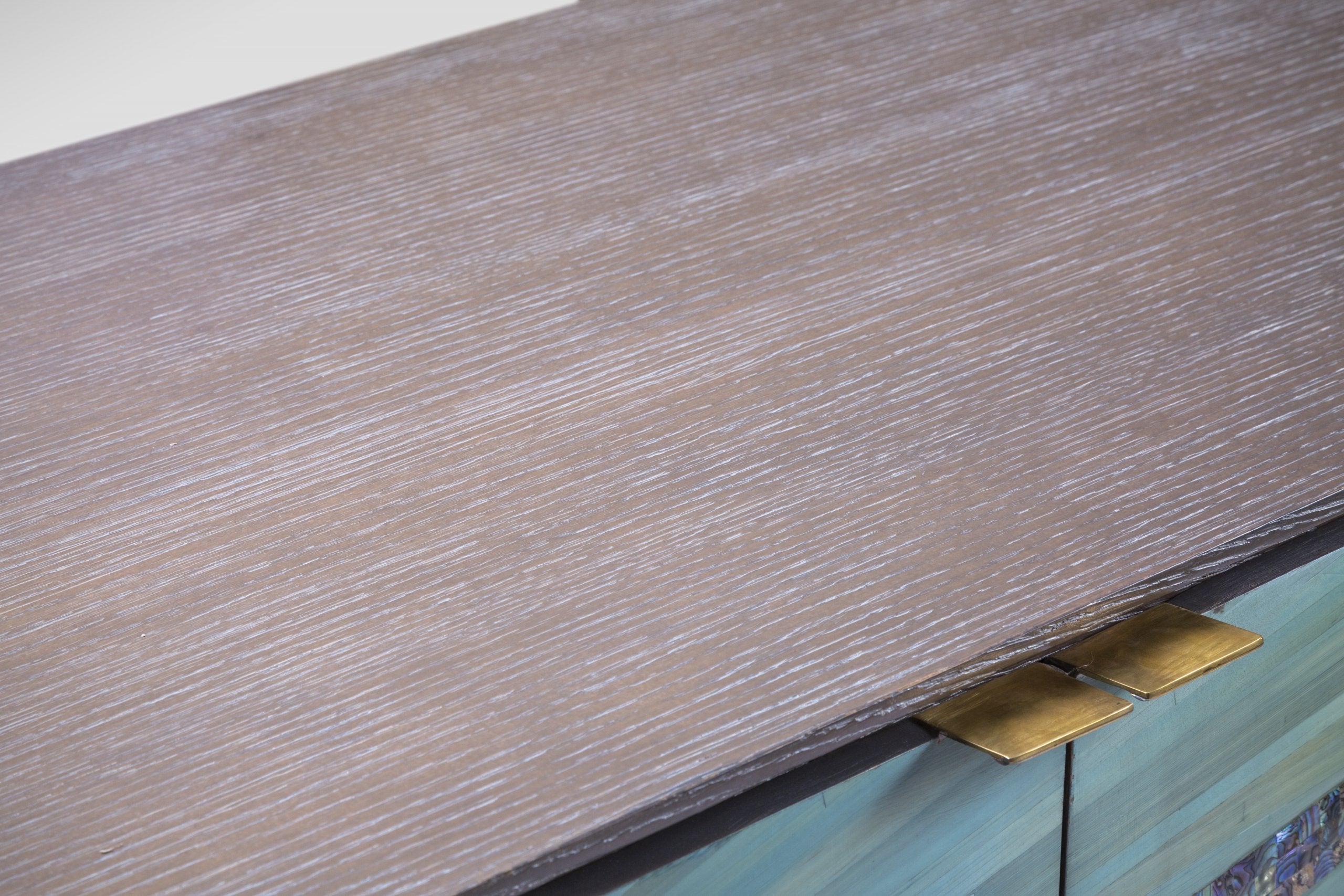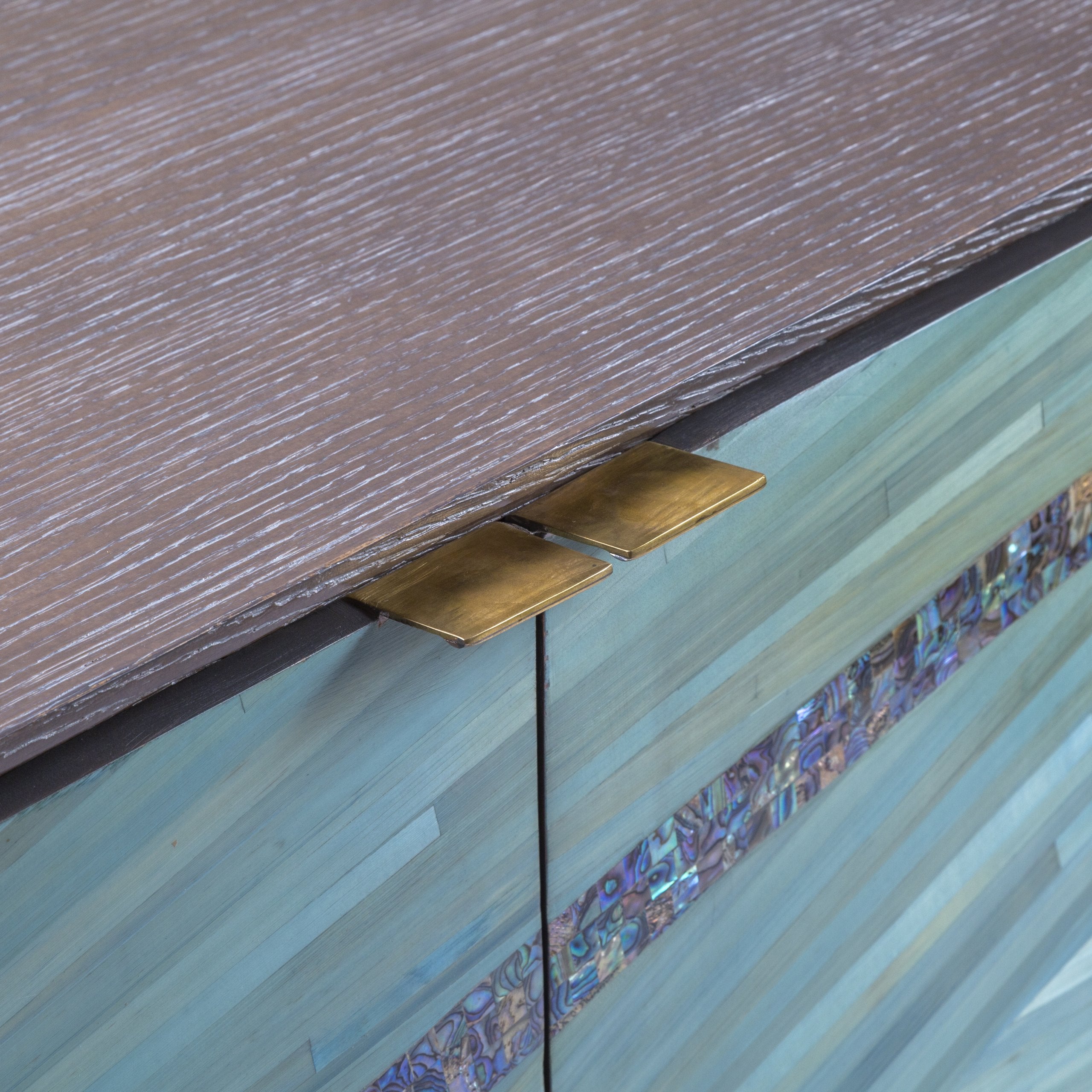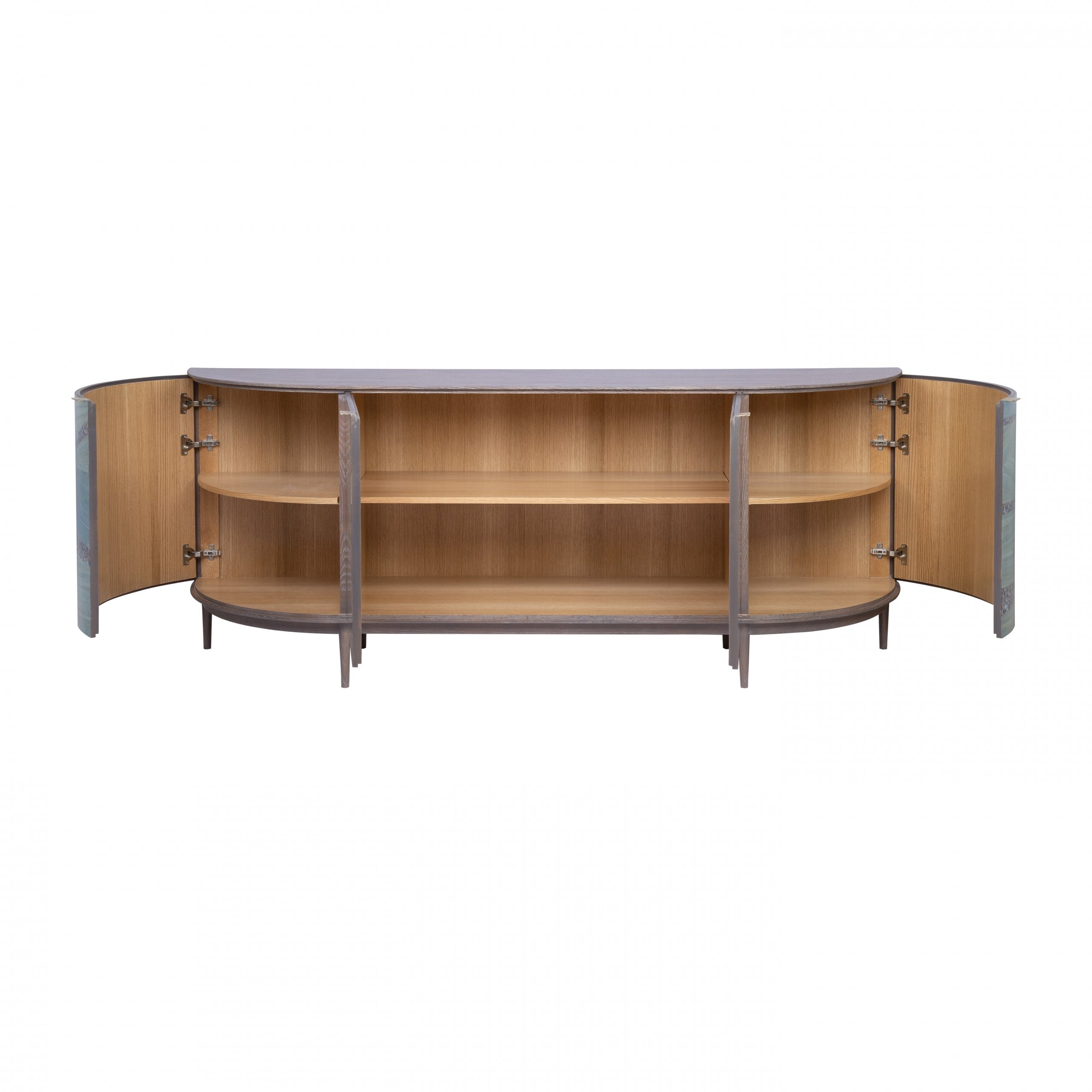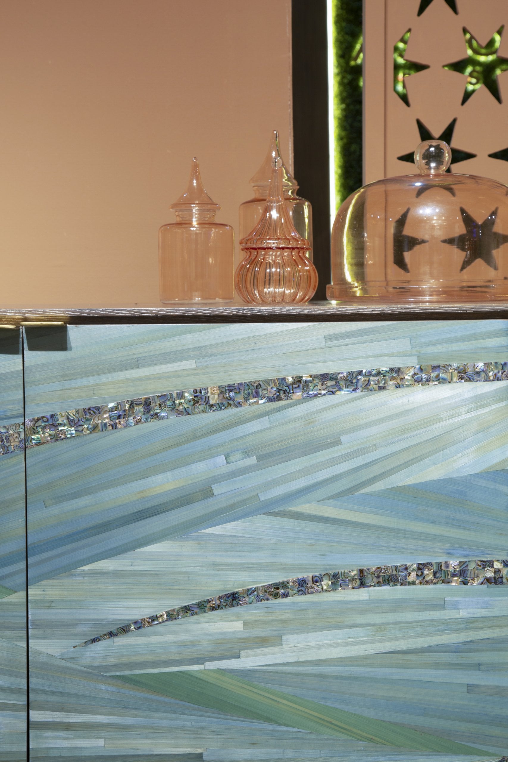 A distinctive dining buffet that is a feast for the eyes. Hand-laid, luscious shades of blue, signature Shewekar-Straw infused with unique turquoise mother-of-pearl, give it an ethereal look and feel. The curved sides complement the intertwined, flowing patterns, all floating seamlessly on a delicate wooden base, making this a true masterpiece that lifts everyone’s spirits.
