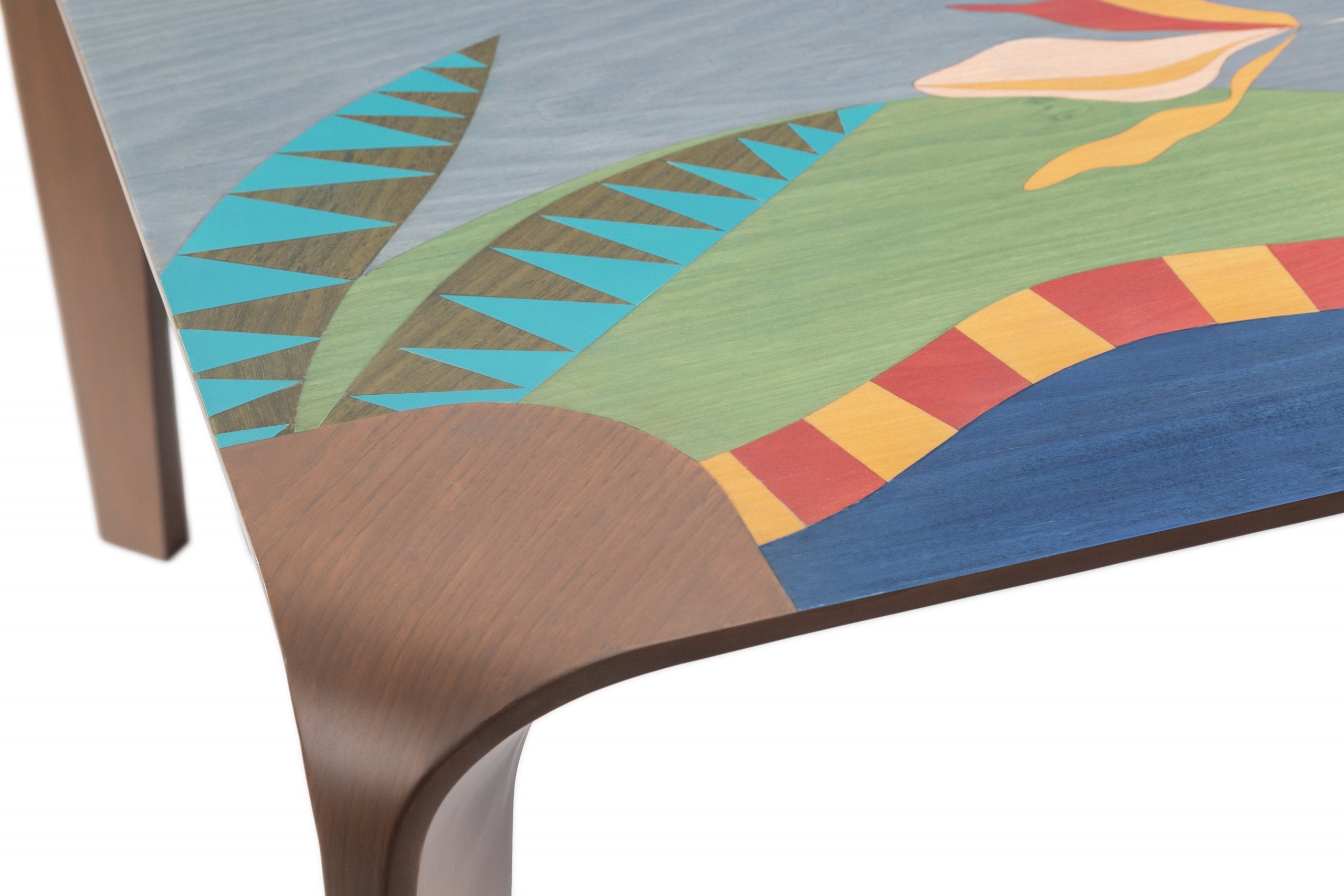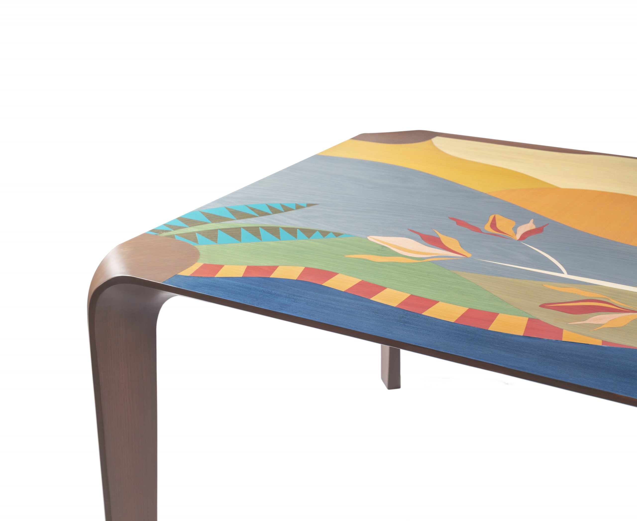 This wondrous table brings rolling dunes and beautiful sunsets right into your dining room to share with your loved ones. Delicate lines and masterfully chosen veneer colors make this piece a natural beauty. Despite the time and effort spent in designing and making this table, it truly feels effortless and light in any space. The elegant curvy legs are made of massive walnut wood.