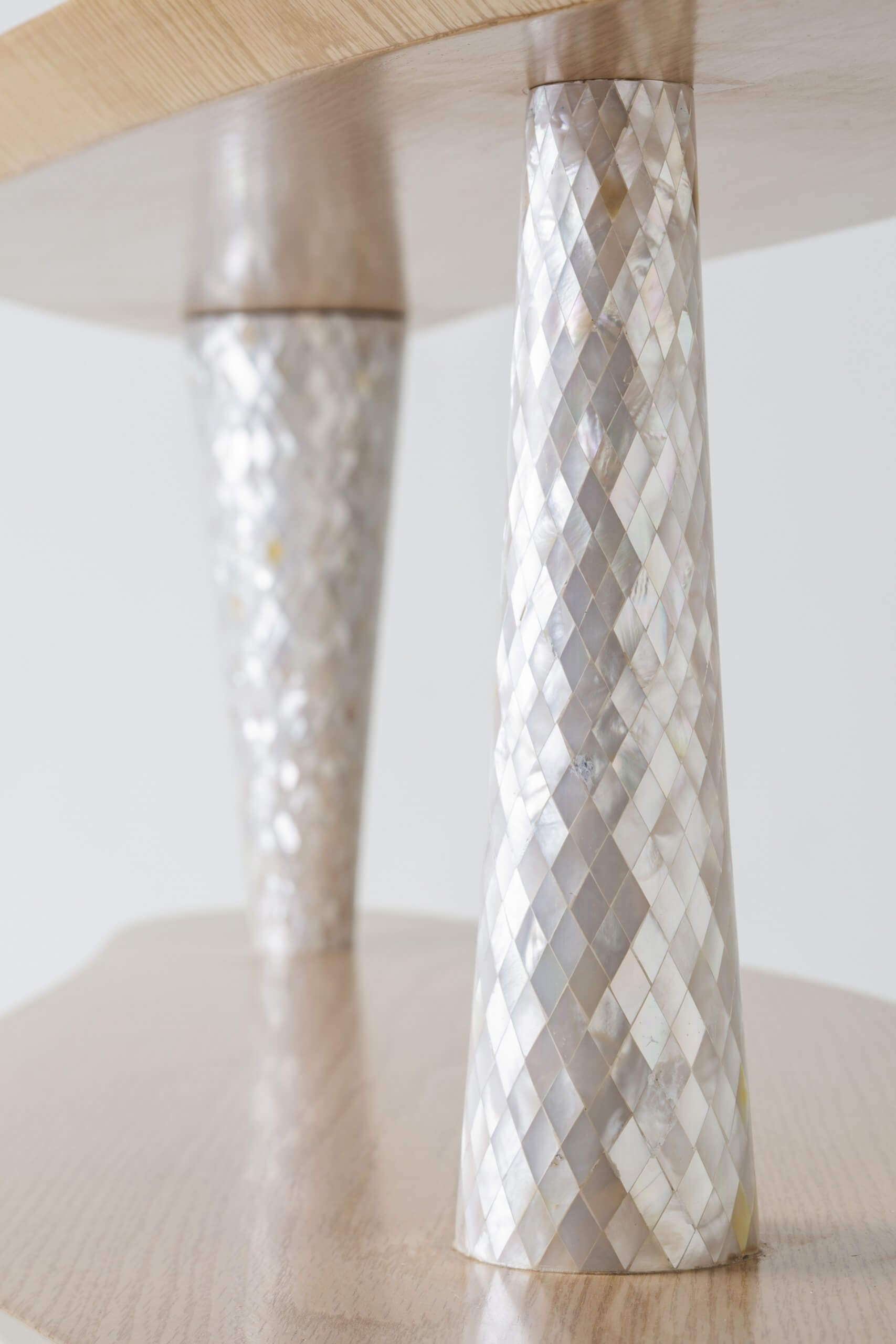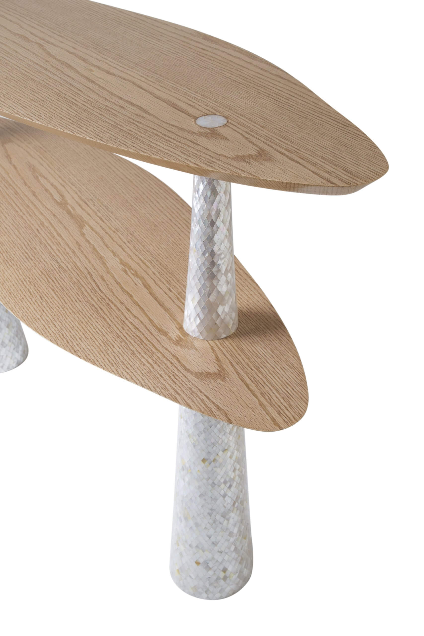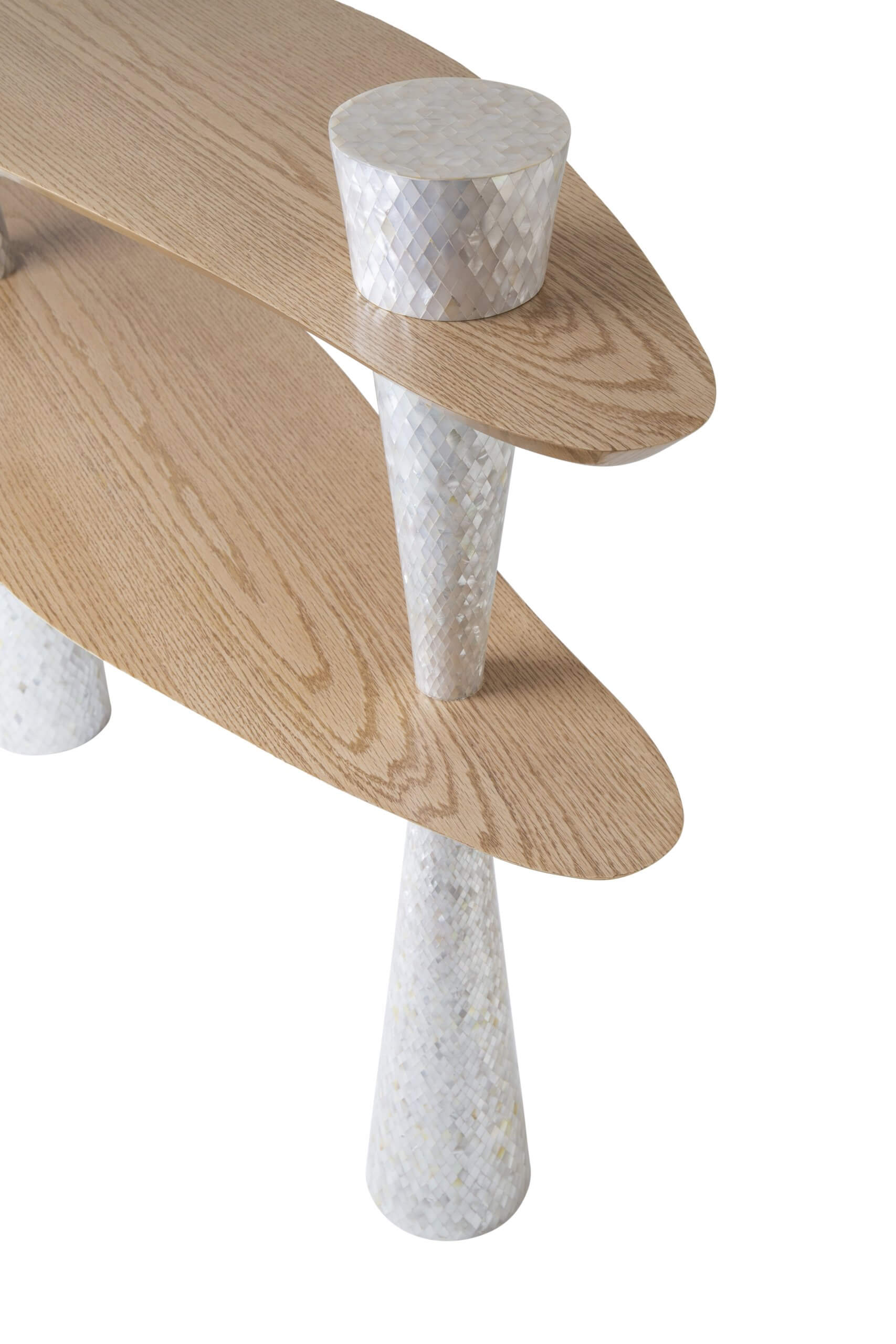 With legs shaped like a twirling tornado, this console is an embodiment of the winds of change. Contrasting lines and materials make this console really special. The double curvy tops are intersected by sharp straight legs. The natural oak grain is matched with a delicate geometric pattern of hand-laid mother-of-pearl. It is a beautiful piece that is sure to change the mood and uplift the spirit in any space. It can be placed as an entrance masterpiece or as a side bar in any space.